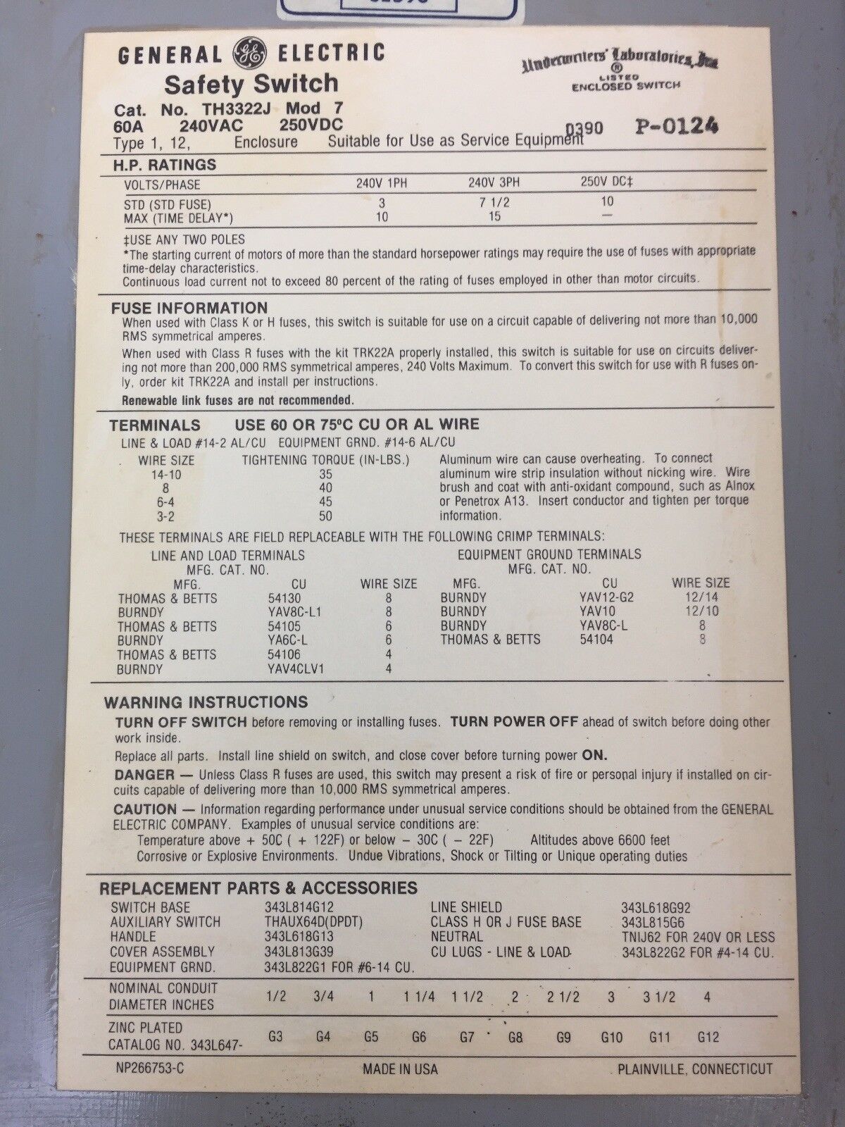 GE TH3322J SAFETY SWITCH 60A 240VAC 250VDC 3 FUSES