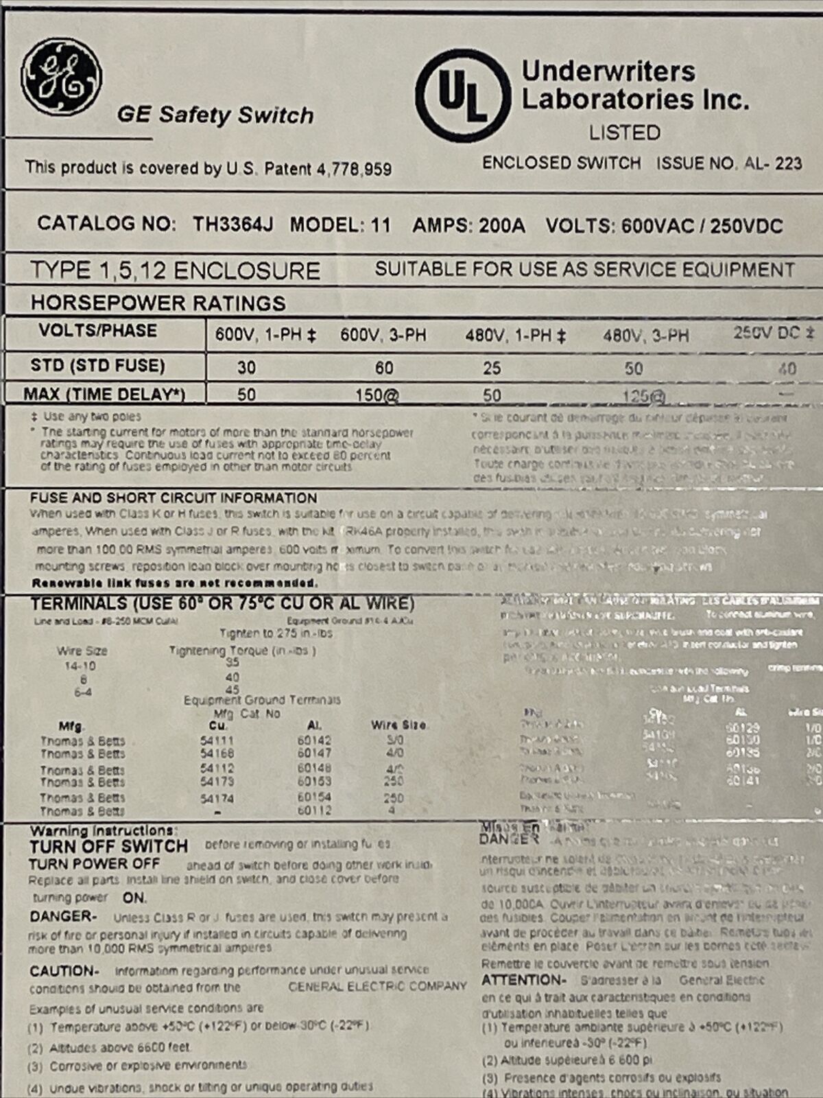 GE TH3364J MODEL 11 FUSIBLE SAFETY SWITCH 200A 600VAC 250VDC 150HP TYPE 1, 5, 12