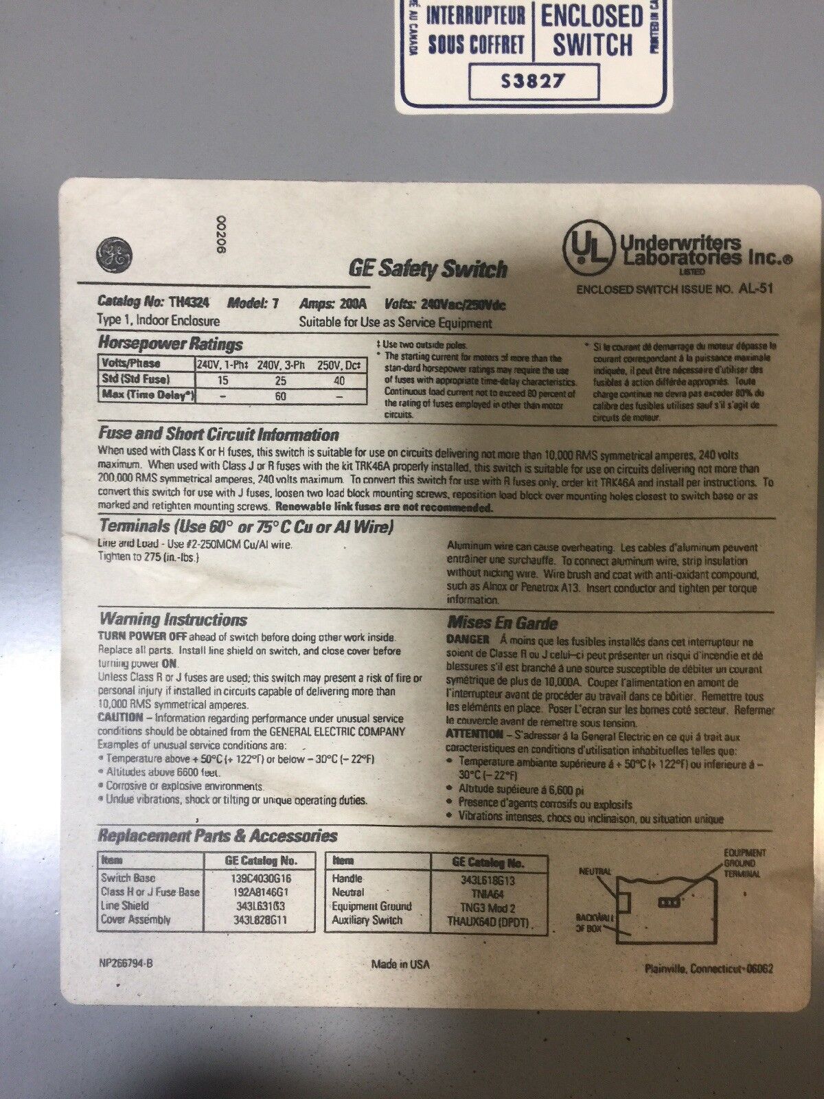 GE TH4324 SAFETY SWITCH 200A 240VAC 250VDC 60HP TYPE 1