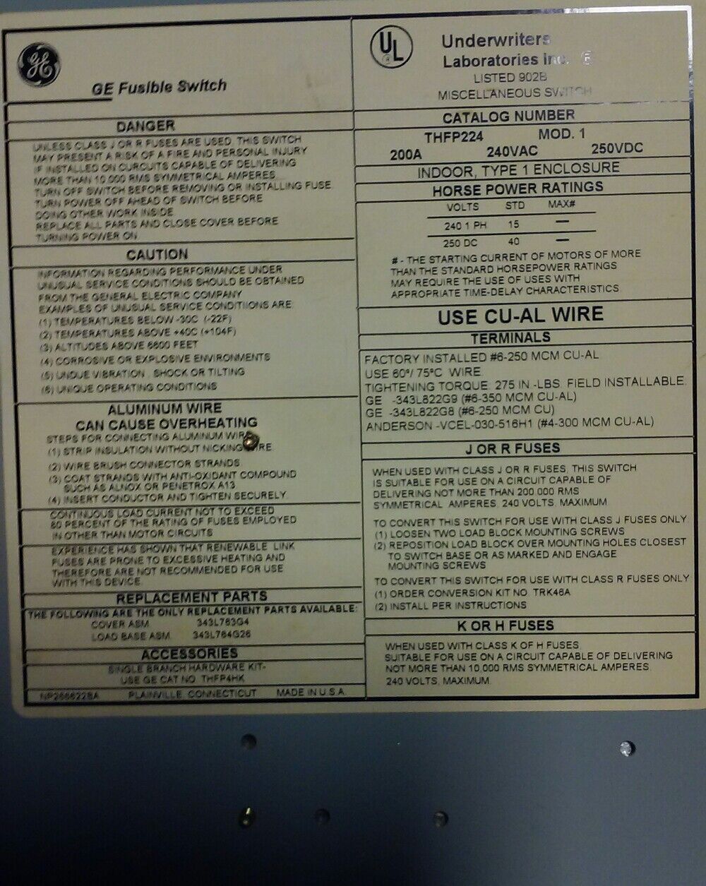 GE THFP224 MODEL 1 FUSIBLE PANELBOARD SWITCH UNIT 2P 200A 240VAC 250VDC