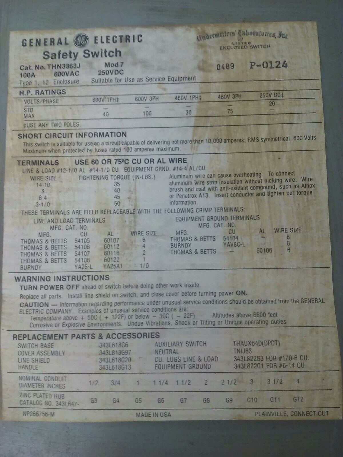 GE THN3363J NON-FUSIBLE SAFETY SWITCH 3PH 100A 600V 100HP TYPE 1/12 ENCLOSURE