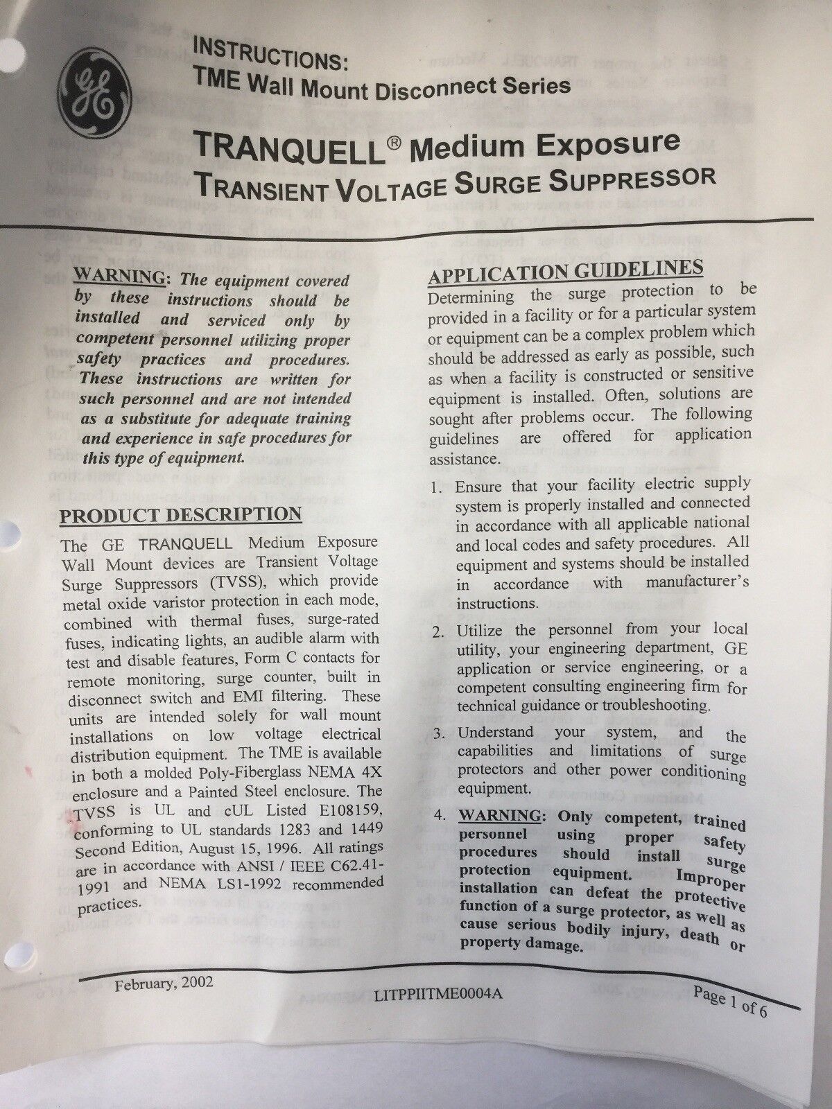 GE TME120Y100WMN1 TRANSIENT VOLTAGE SURGE SUPPRESSOR 120/208V THREE PHASE 50/60HZ UL SUPRESSION VOLTAGE RATING 500Vpk L-N, L-G, N-G