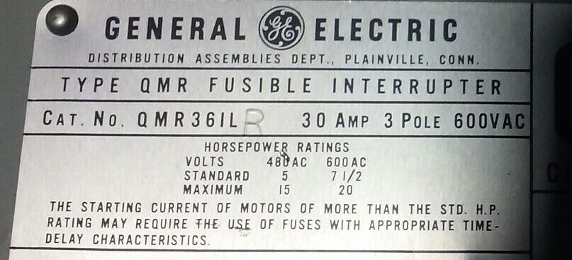 GE TYPE QMR QMR361L QMR361R FUSIBLE TWIN PANELBOARD SWITCH 3P 30A 600V 20HP