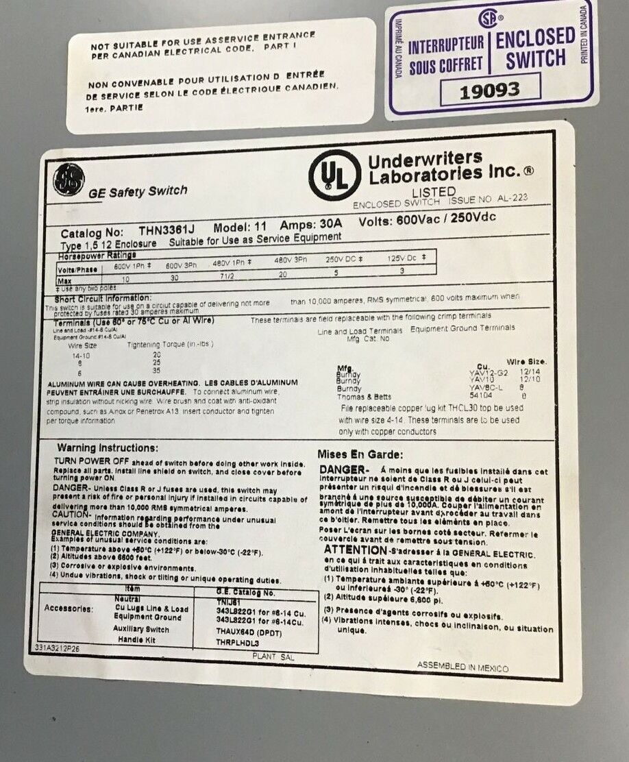 GENERAL ELECTRIC THN3361J SAFTEY SWITCH NON FUSIBLE 30A MODEL 11 600VAC/250VDC