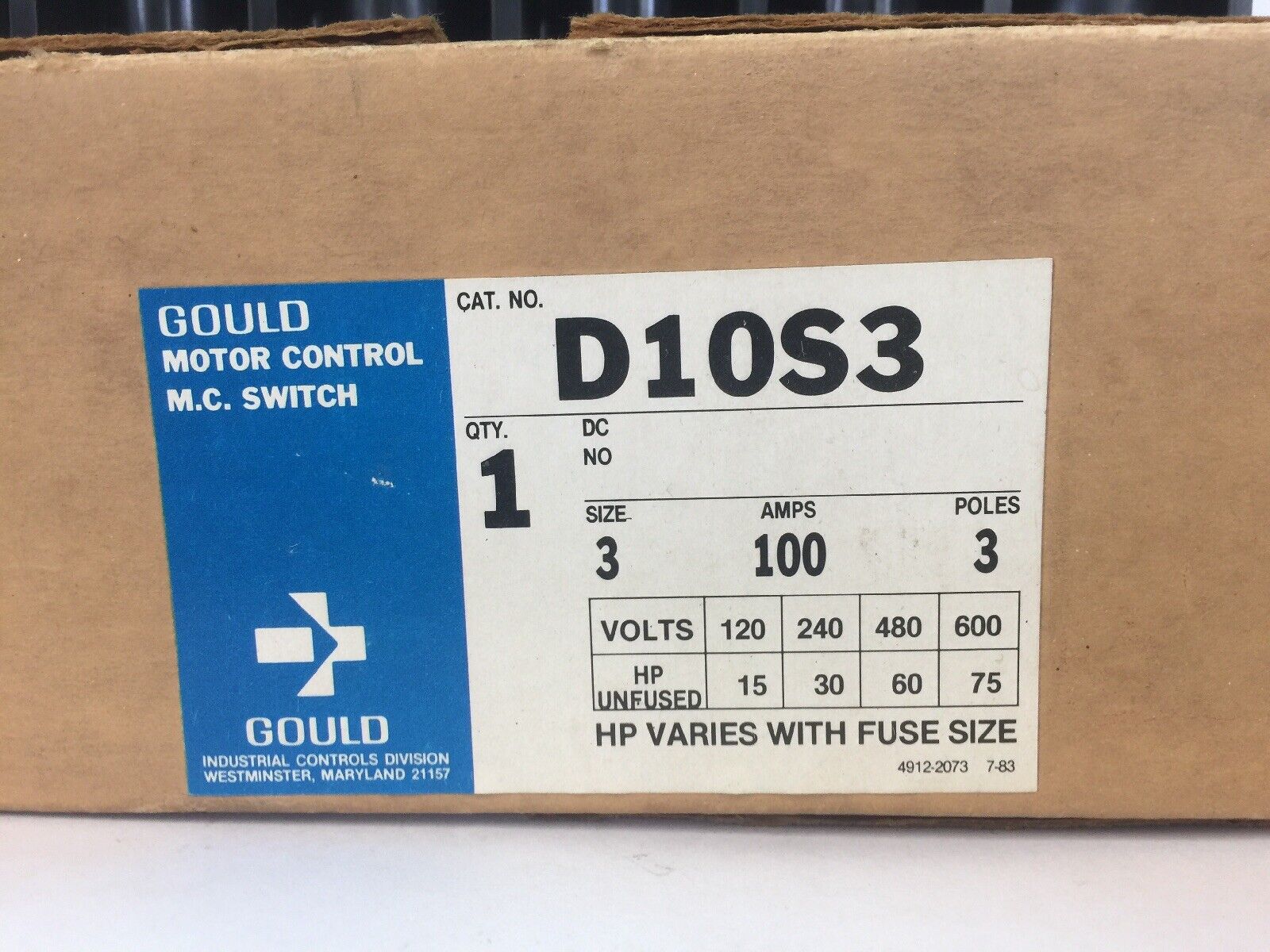 GOULD D10S3 MOTOR CONTROL M.C. SWITCH SIZE 3 100AMPS 3 POLES 600V 75HP UNFUSED HP VARIES WITH FUSE SIZE