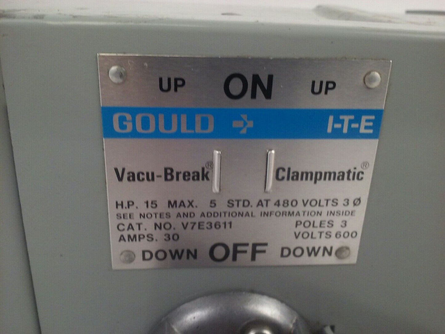 GOULD ITE V7E3611 TWIN VACU BREAK CLAMPMATIC SWITCH 3P 3PH 30A 600V 20HP