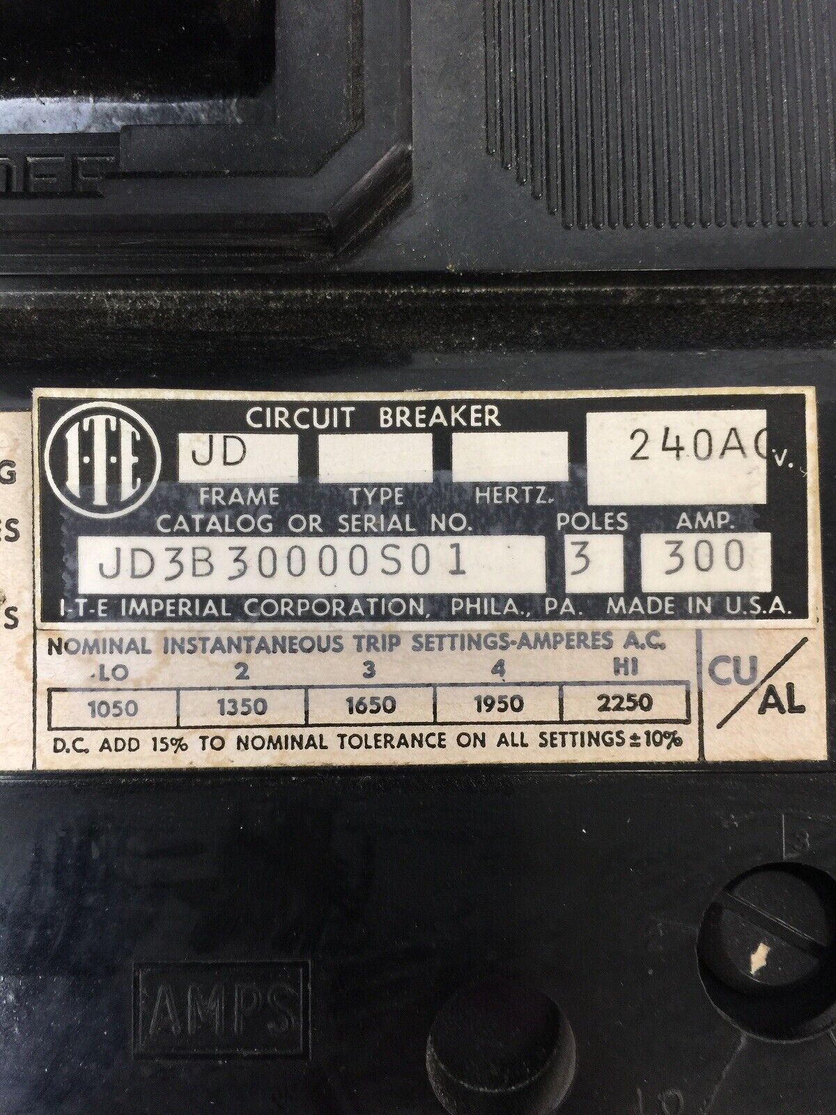 I-T-E JD3B30000S01 CIRCUIT BREAKER 300AMP 240VAC 3 POLE MAG ADJ TRIP
