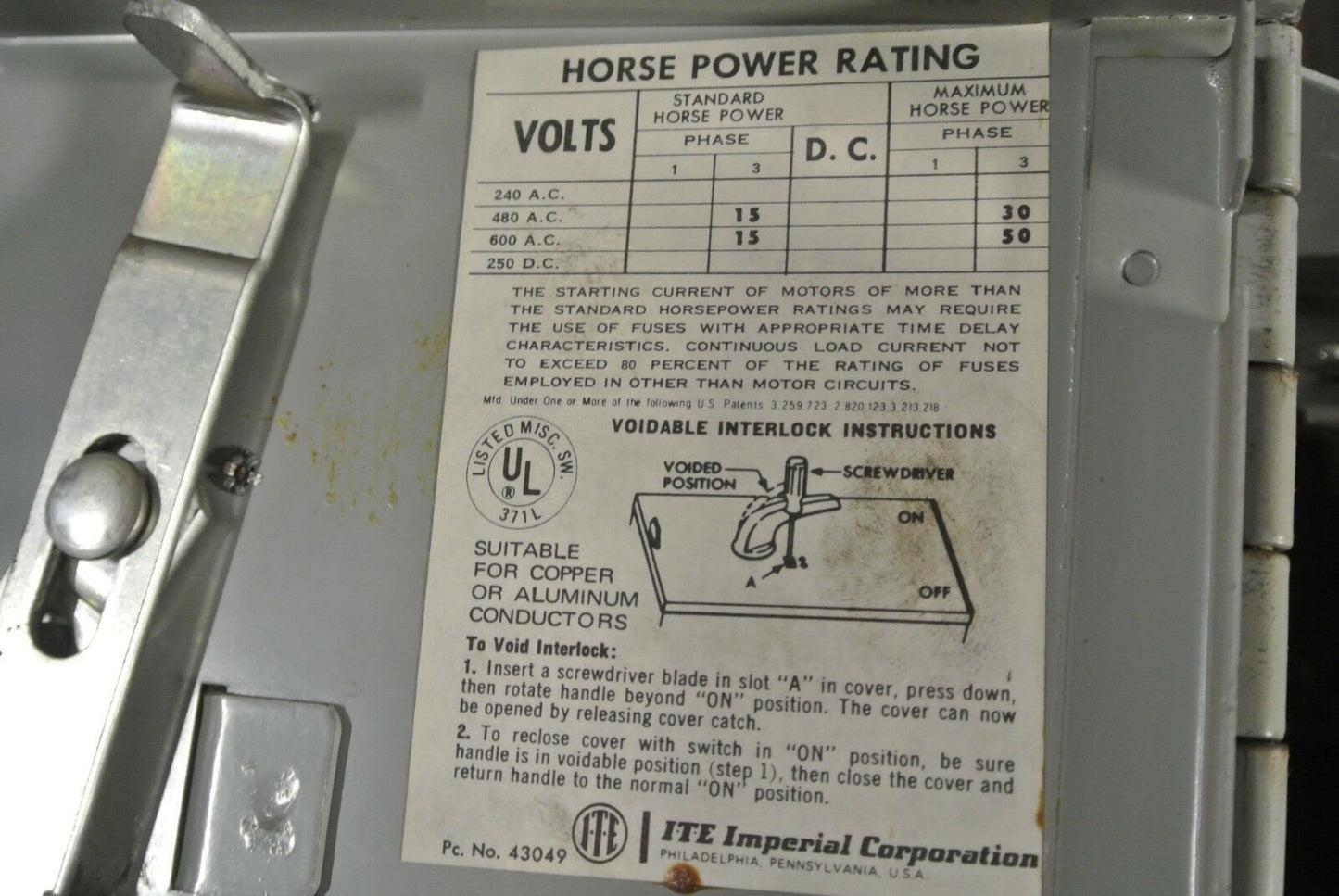 I-T-E CLAMPMATIC VACU-BREAK TWIN PANELBOARD SWITCH