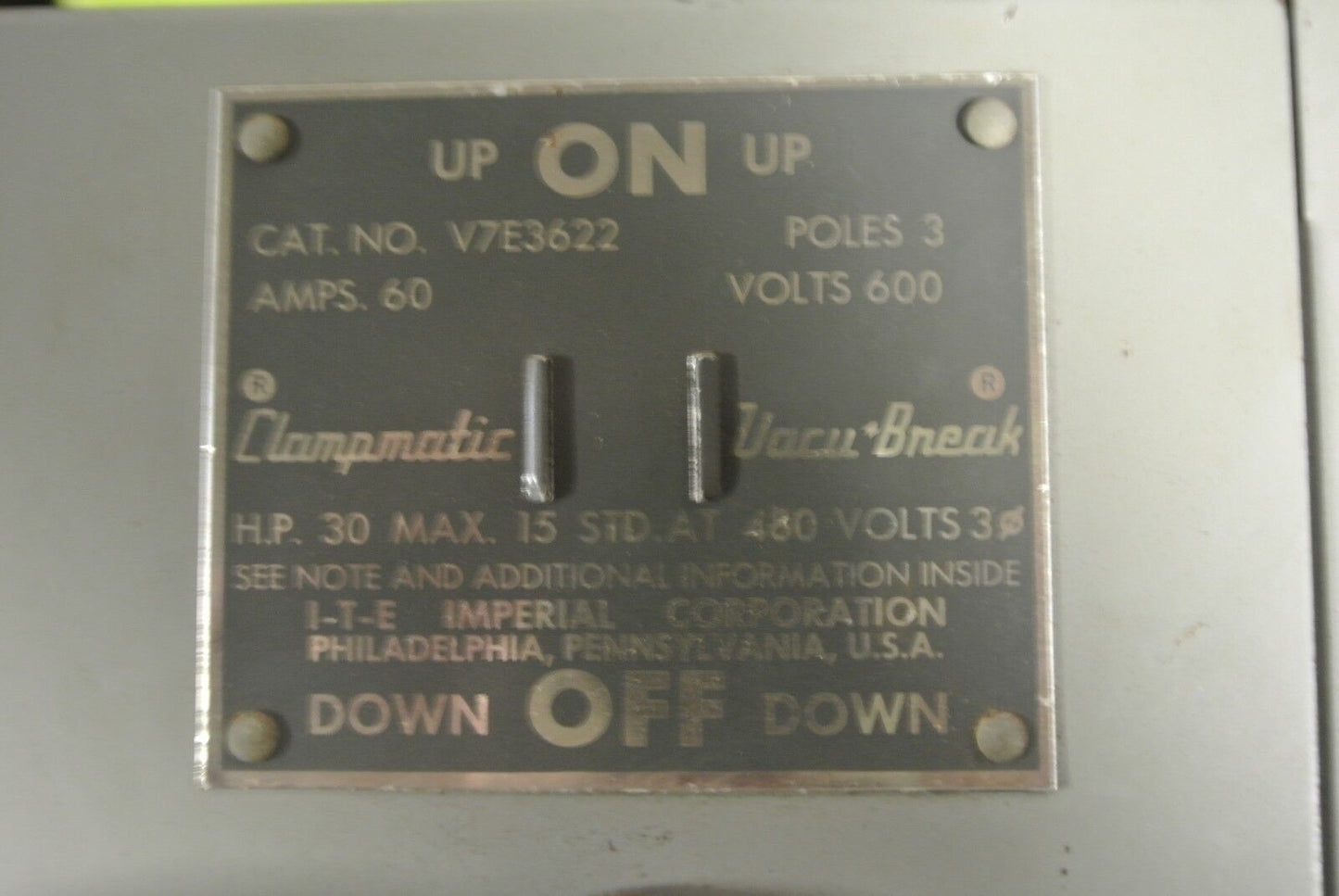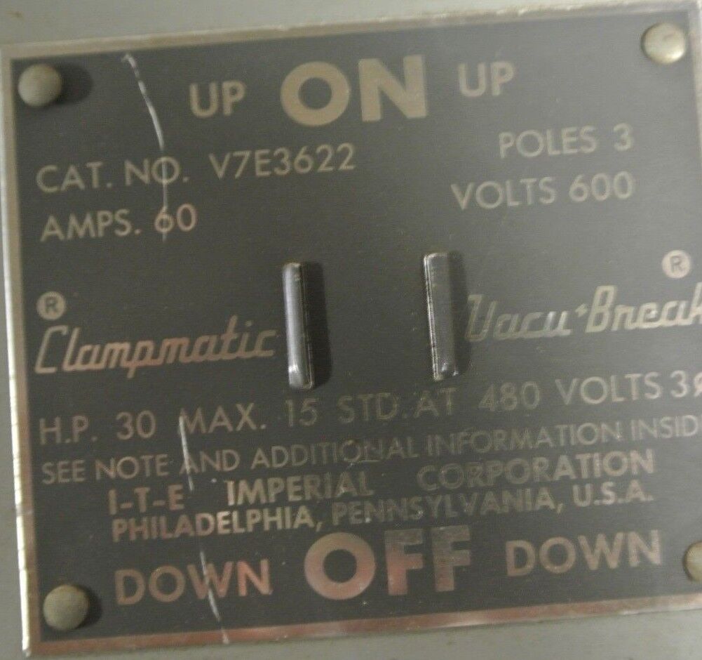 I-T-E V7E3622 CLAMPMATIC VACU-BREAK TWIN PANELBOARD SWITCH - 600V, 60A, 3-POLE