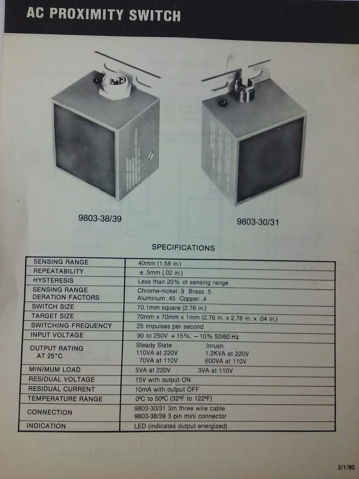 ISSC 9803-38 SOLID STATE METALLIC PROXIMITY SWITCH, 90-250VAC, 50/60HZ, 6VA, 40VA, NEW