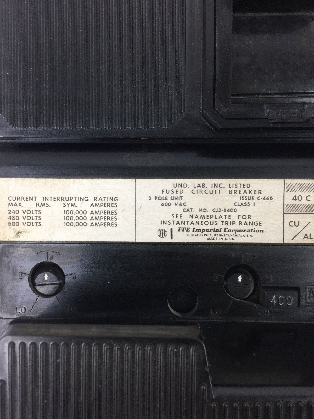 ITE CJ3-B400 FUSED CIRCUIT BREAKER 600 VAC 3 POLE UNIT 400 AMPS