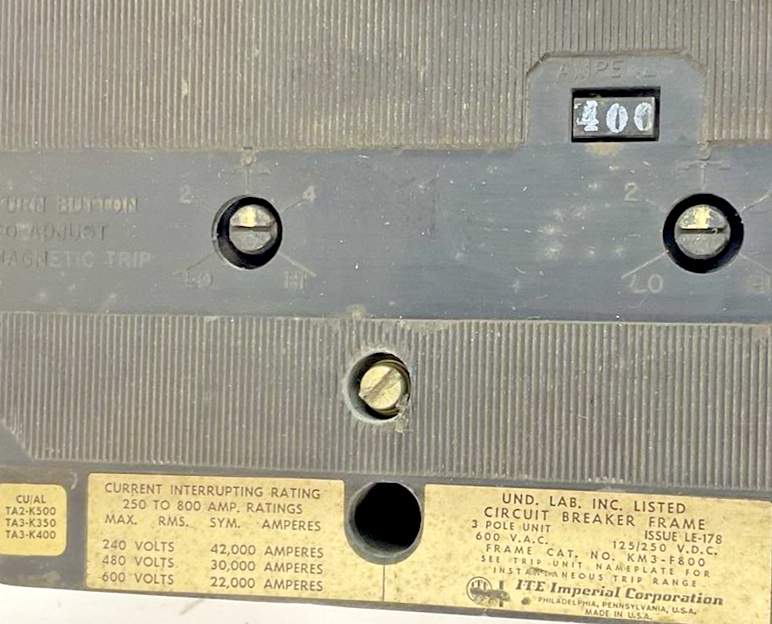 ITE KM3-F800 CIRCUIT BREAKER 400A 600VAC 125/250VDC 3POLE