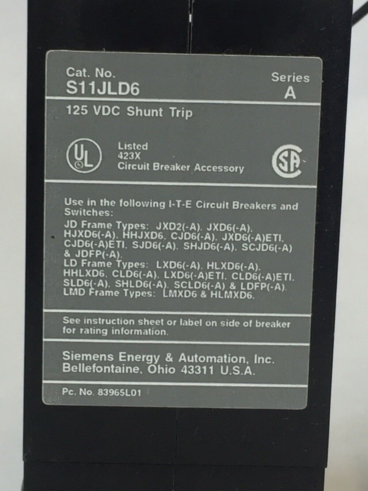ITE S11JLD6 SHUNT TRIP 125VDC