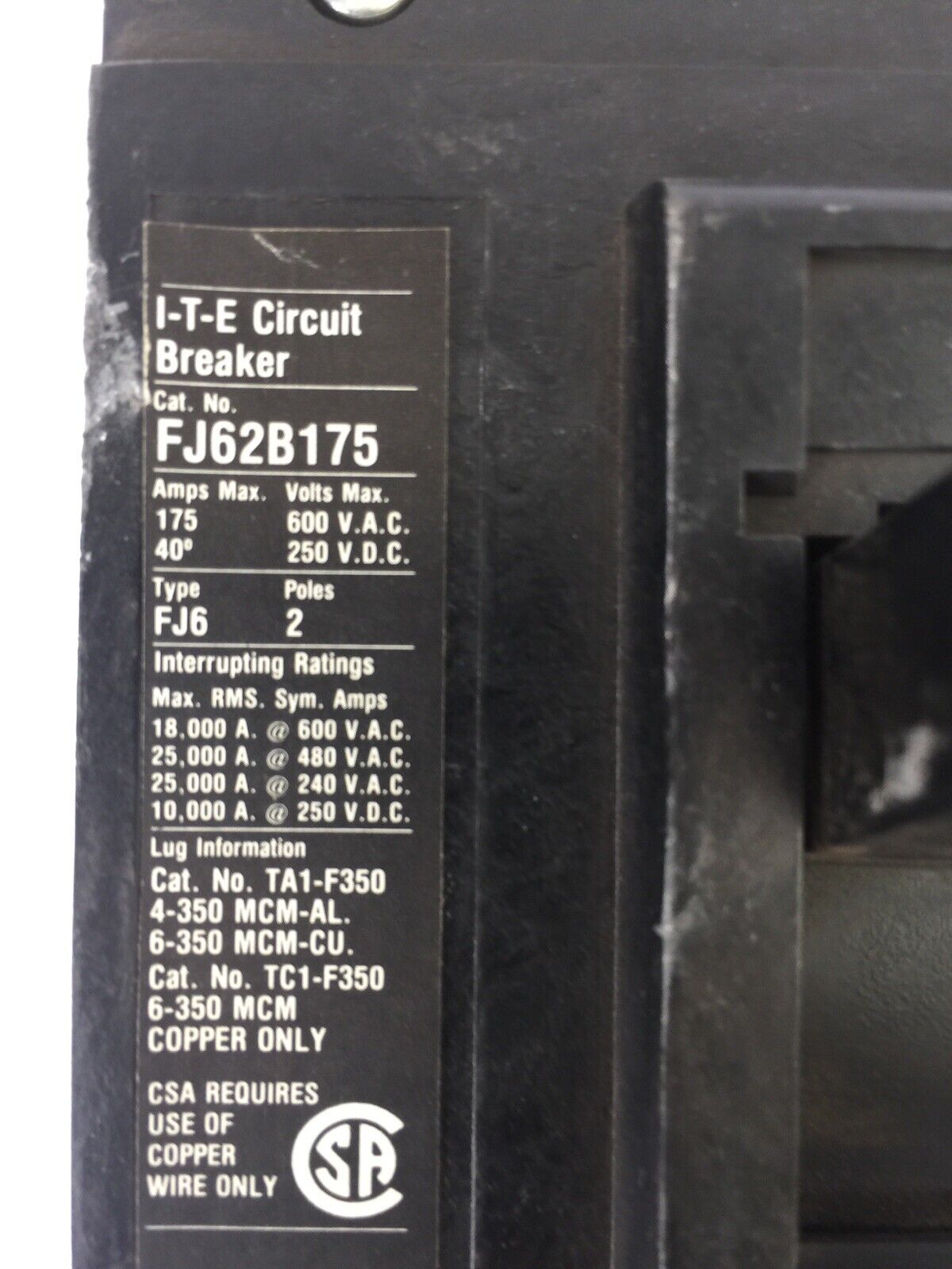 ITE SIEMENS FJ62B175 CIRCUIT BREAKER 600VAC 250VDC 175AMP 2POLE