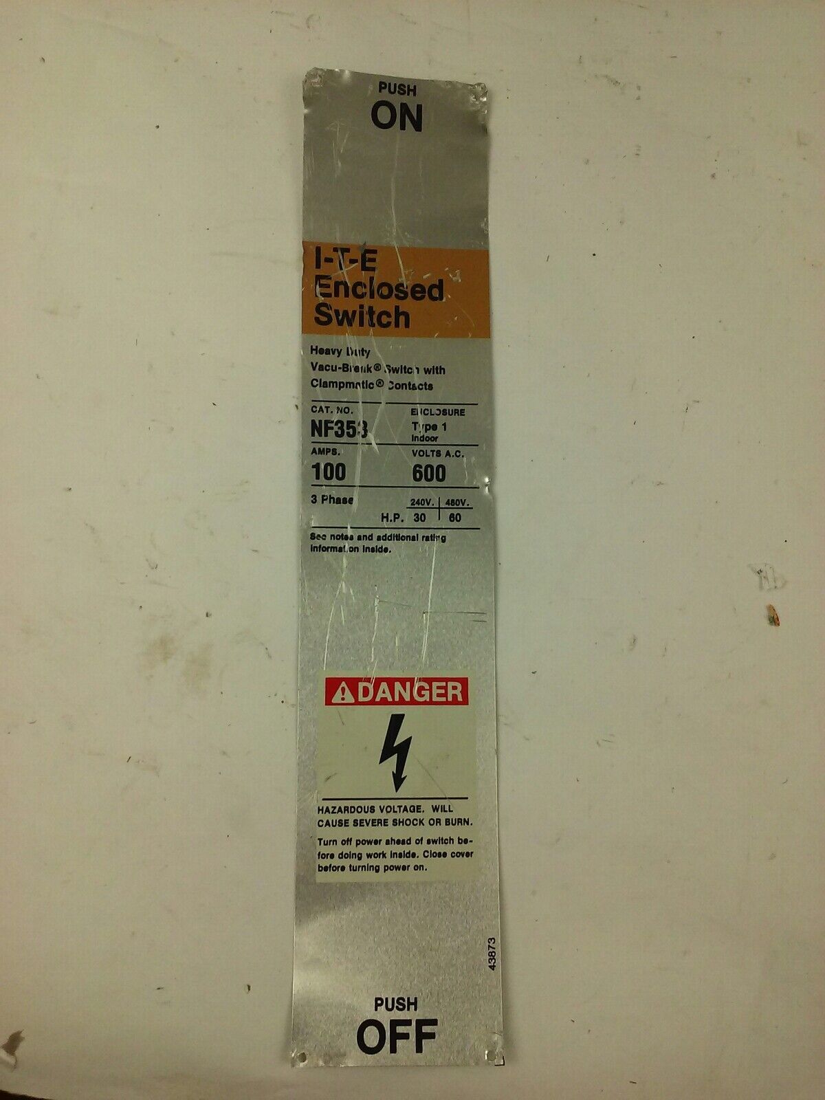 ITE SIEMENS NF353, TYPE 1 INDOOR ENCLOSURE, HEAVY DUTY SAFETY SWITCH, 100A, 600VAC/250VDC, 3PH, 60 MAX H.P., INDOOR, NEW, FRONT METAL LABEL IS NOT ATTACHED!!!