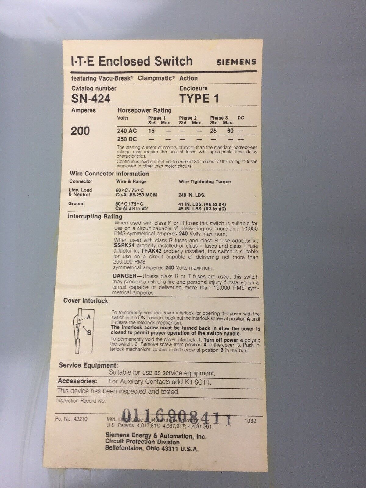 ITE SN424 HEAVY DUTY VACU-BREAK SWITCH WITH CLAMPMATIC CONTACTS 200 AMPS 240 VAC