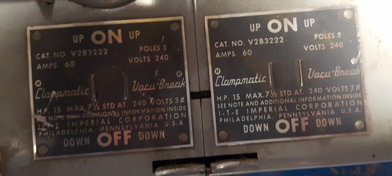 ITE V7B3222 TWIN FUSIBLE CLAMPMATIC VACU BREAK PANELBOARD SWITCH 60A 240V 3P 15