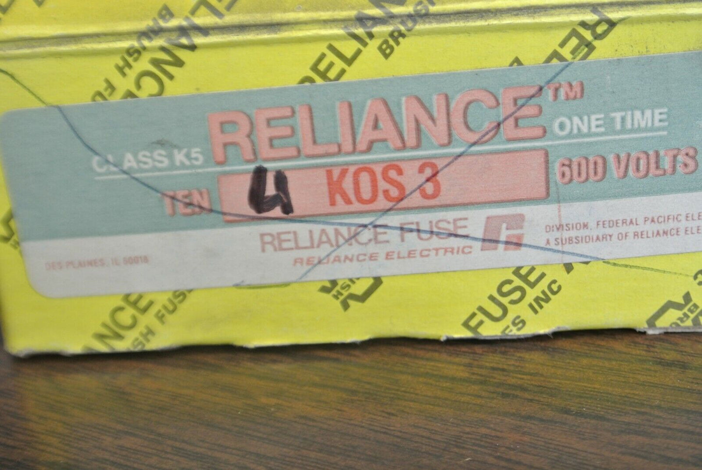 LOT of 4 / RELIANCE KOS3 ONE-TIME CLASS K5 FUSE / 600V / 3A / NEW SURPLUS