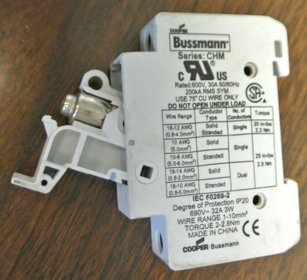 LOT of 7 / BUSSMANN CHM SERIES FUSE HOLDER / 600V, 30A, 50/60Hz w/ VARIOUS FUSES