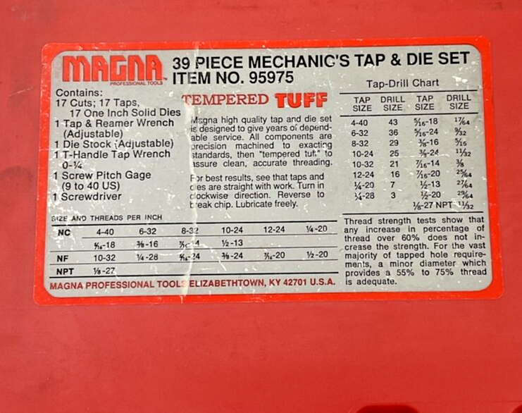 MAGNA 95975 TAP AND DIE SET ***MISSING PIECES READ DESCRIPTION***