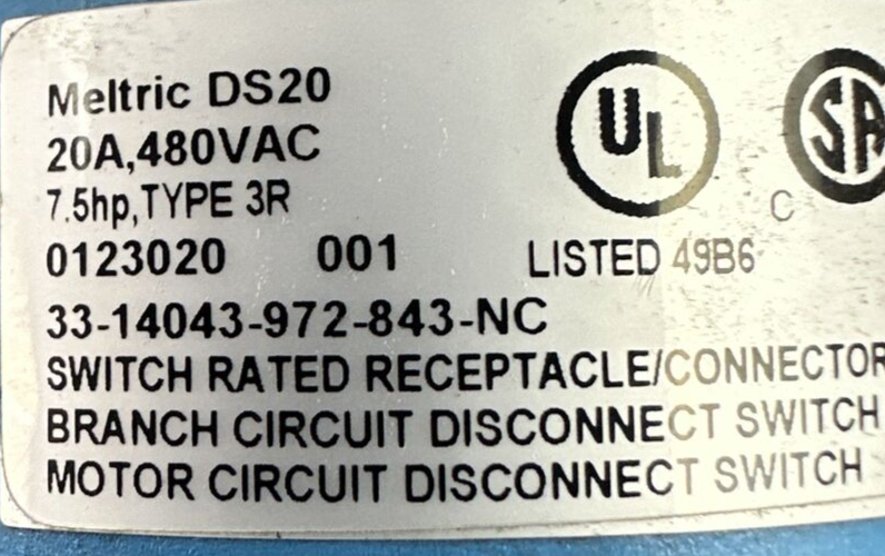 MELTRIC DS20 20A 480VAC 7.5HP TYPE 3R 33-14043-972-843-NC RECEPTACLE/CONNECTOR BRANCH CIRCUIT DISCONNECT SWITCH MOTOR CIRCUIT DISCONNECT SWITCH