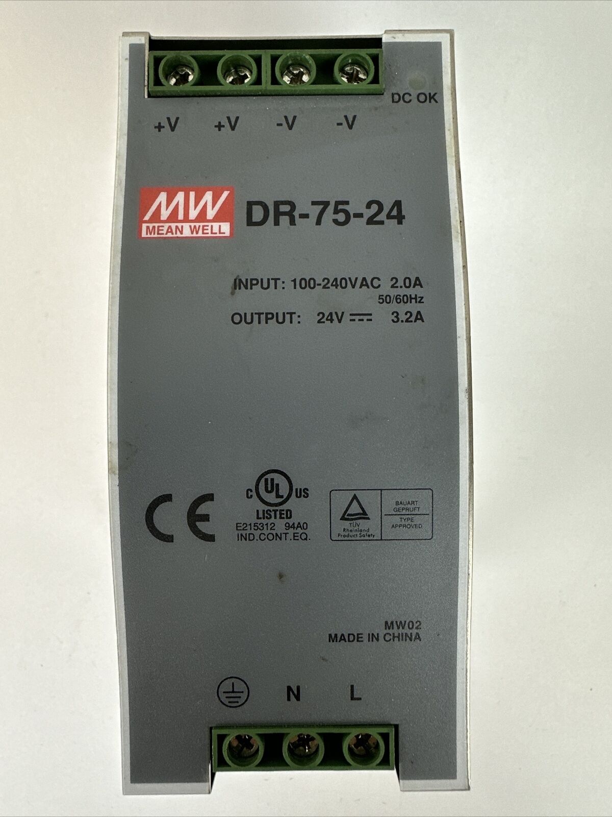 MW MEAN WELL DR-75-24 POWER SUPPLY OUTPUT 24VDC 3.2A INPUT 100-240VAC 2.0A