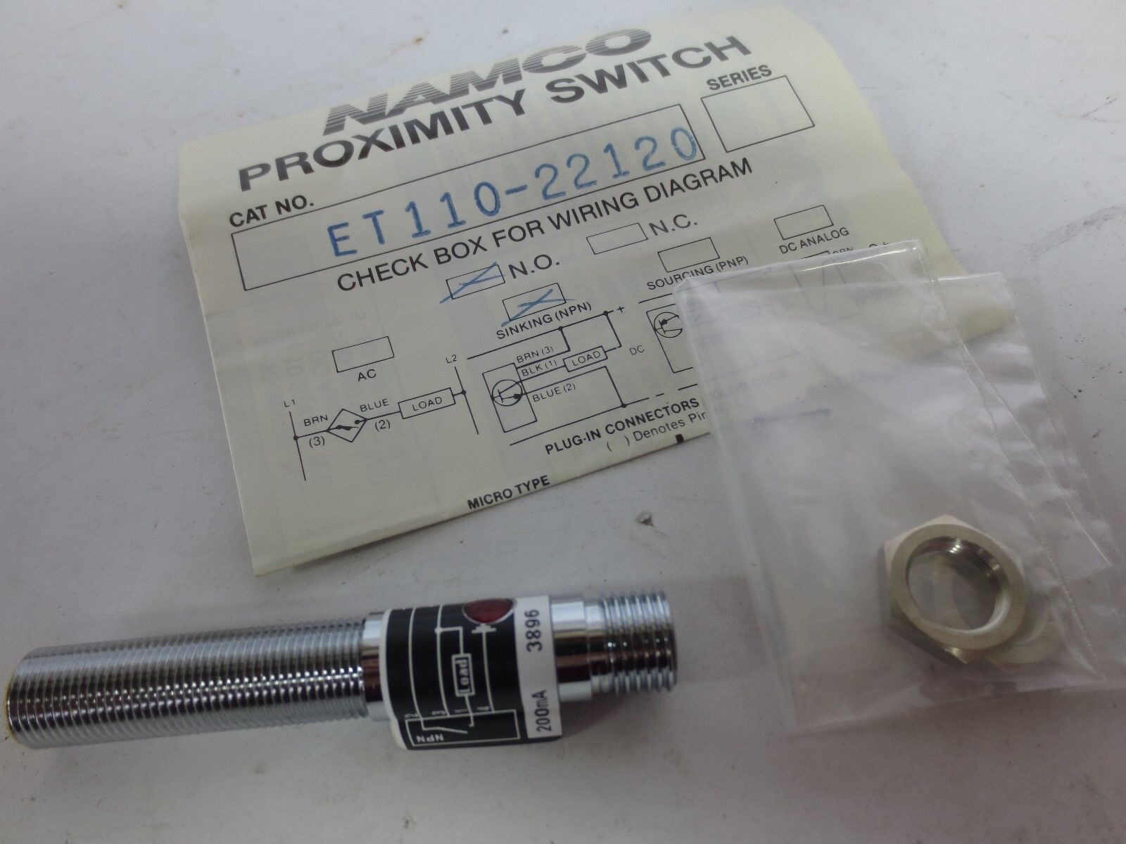 NAMCO CONTROLS ET110-22120 TUBULAR PROXIMITY SENSOR - N.O. - NPN - NEW SURPLUS