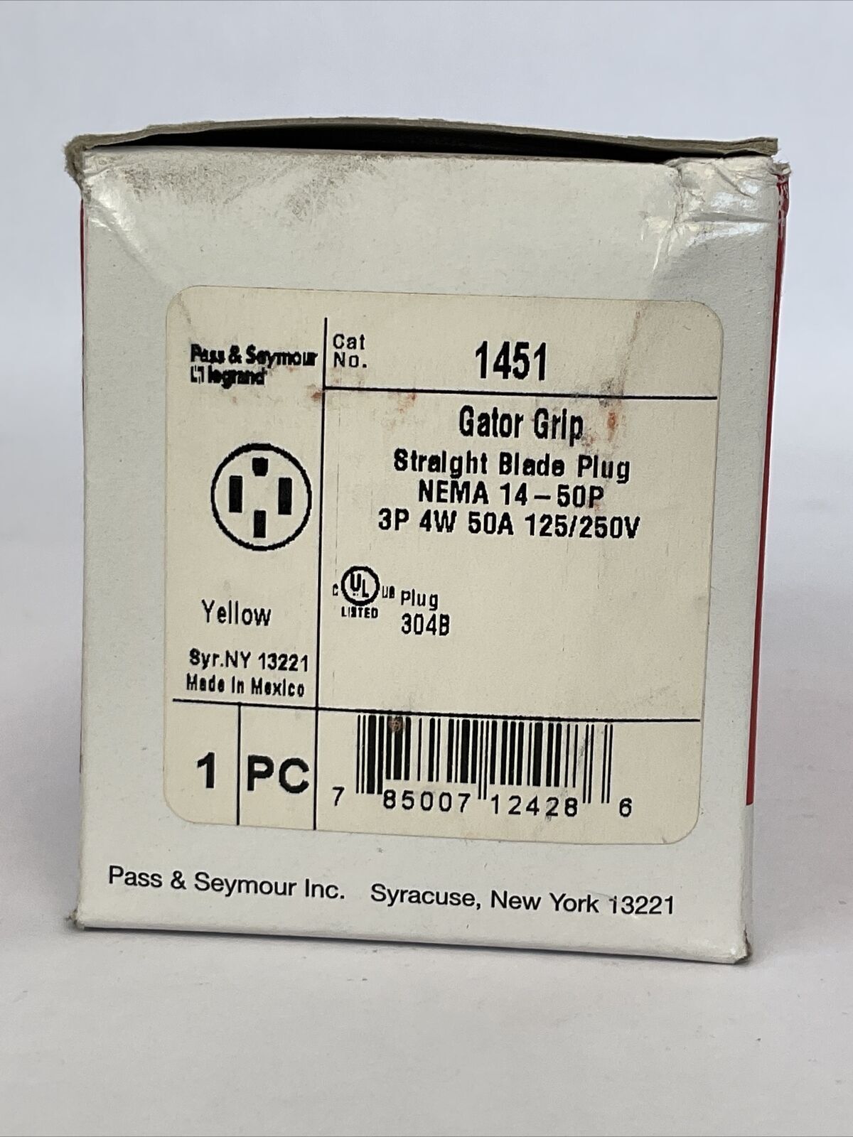 PASS & SEYMOUR 1451 GATOR GRIP STRAIGHT BLADE PLUG 3P 4W 50A 125/250V