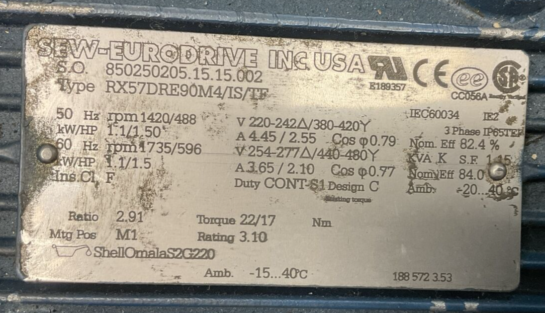 SEW EURODRIVE RX57DRE90M4/IS/TF GEARMOTOR 254/277V 1735/596RPM RATIO 2.91 1.50HP