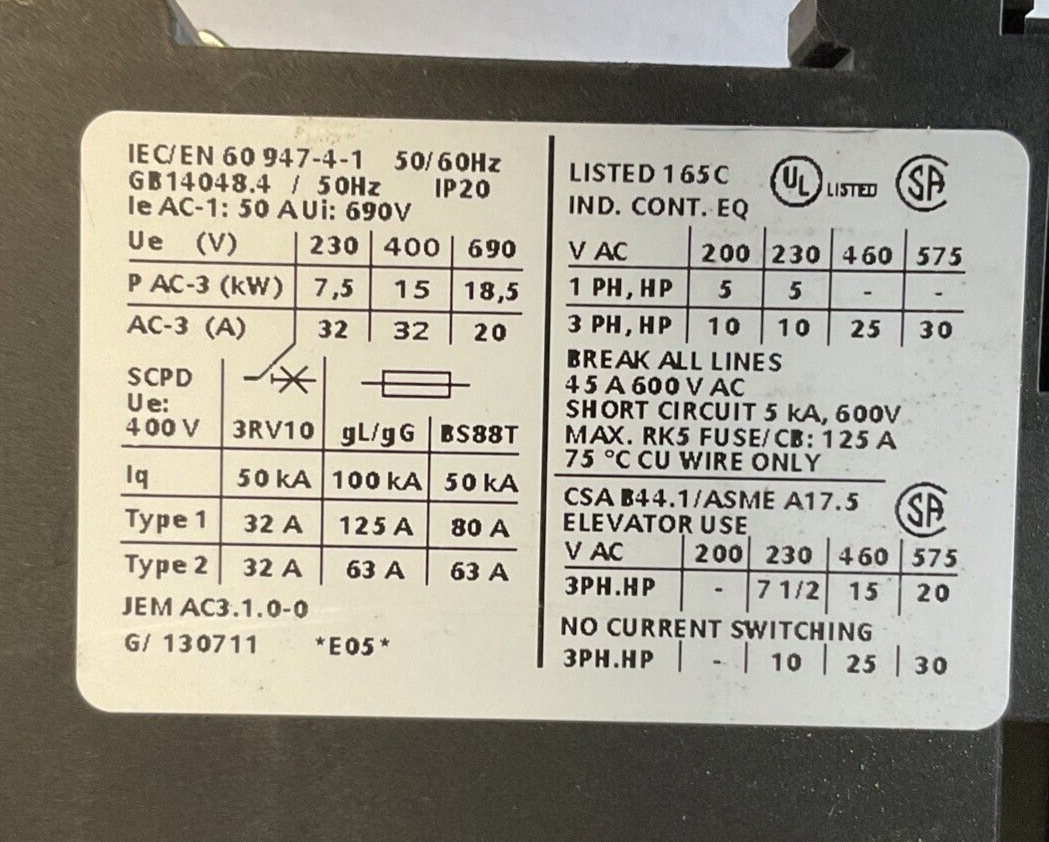 SIEMENS 3RT1034-1BB40 CONTACTOR 50/60HZ 45A 600VAC