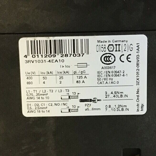 SIEMENS 3RV1031-4EA10 MOTOR CONTROLLER 690V 125A 50/60HZ