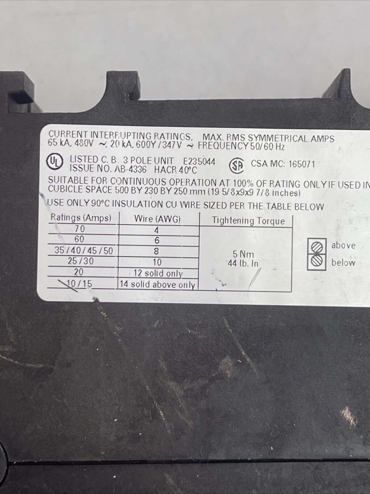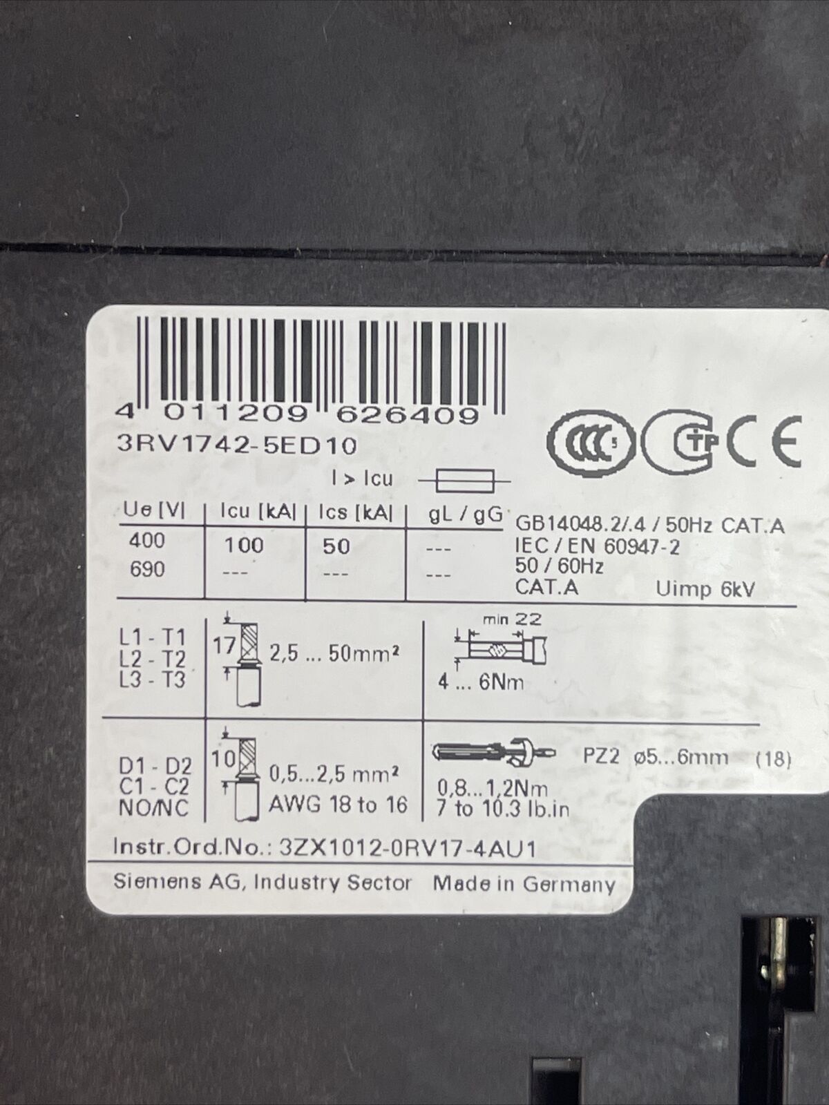 SIEMENS 3RV1742-5ED10 CIRCUIT BREAKER 30A 3P 600Y/347VAC 480VAC