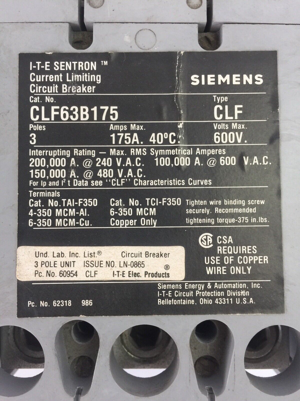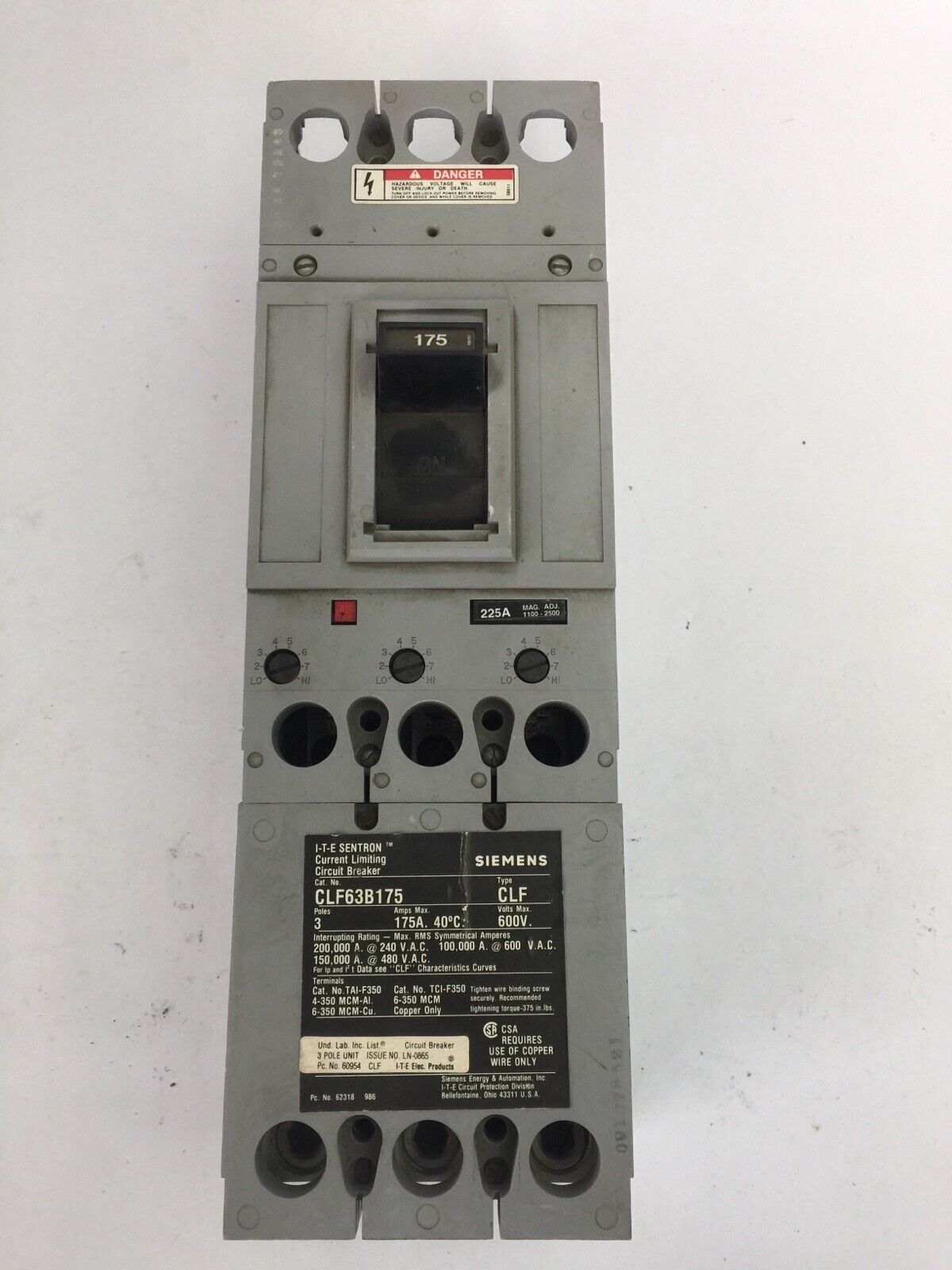 SIEMENS CLF63B175 CIRCUIT BREAKER 600VAC 175AMP 3POLE TRIP 225A