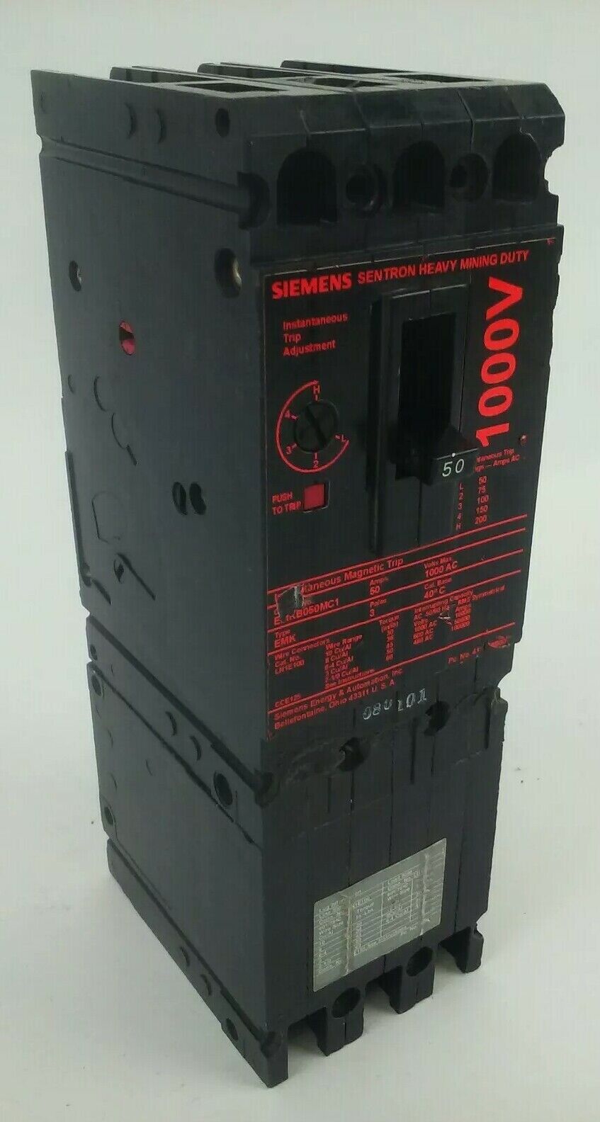 SIEMENS EMKB050MC1 SENTRON HEAVY MINING DUTY BREAKER 50A 1000VAC 3P TYPE EMK