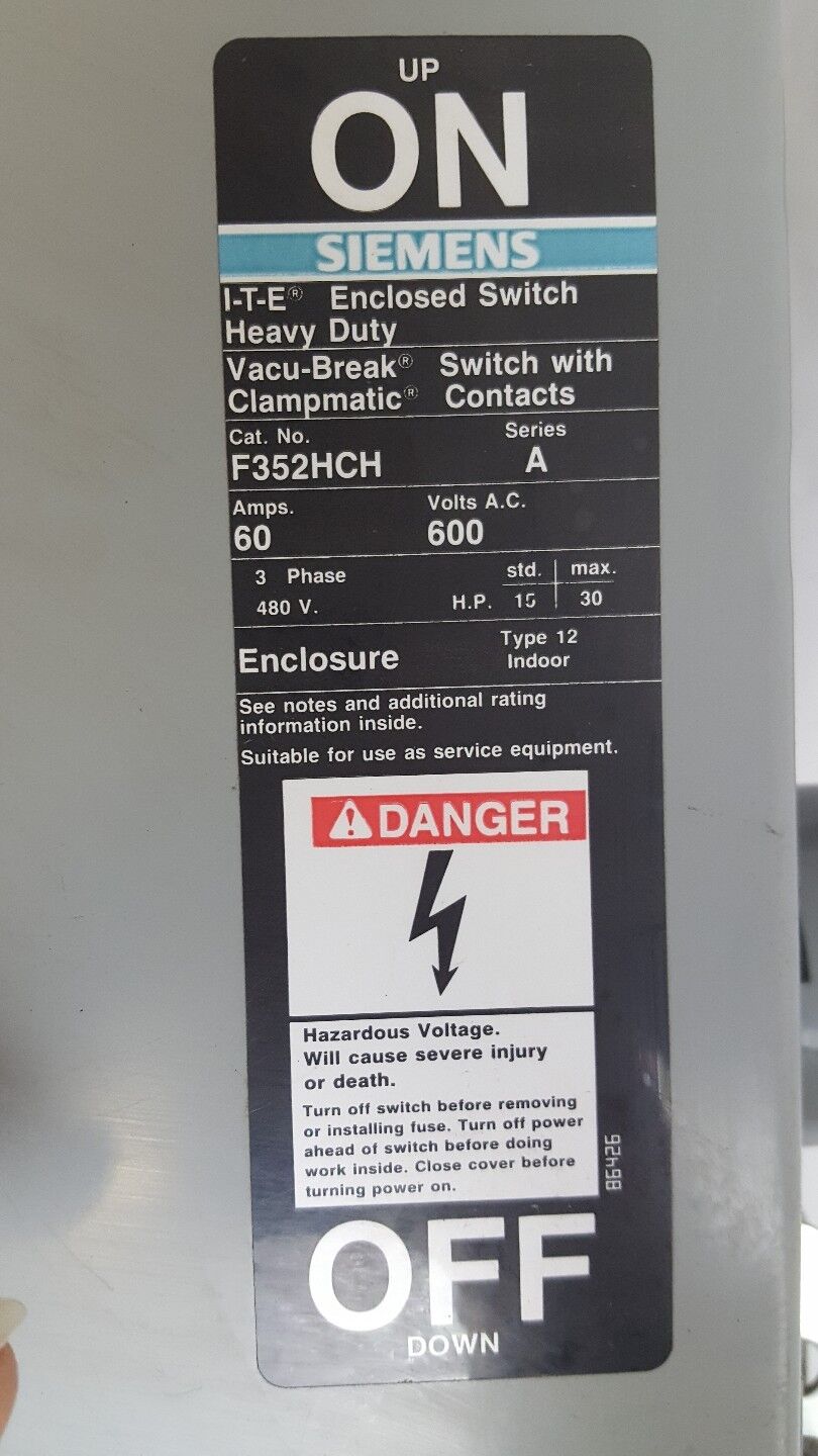 Siemens F352H-CH Series B Type12 W Welder Connector. 60A 600V DISCONNECT SWITCH