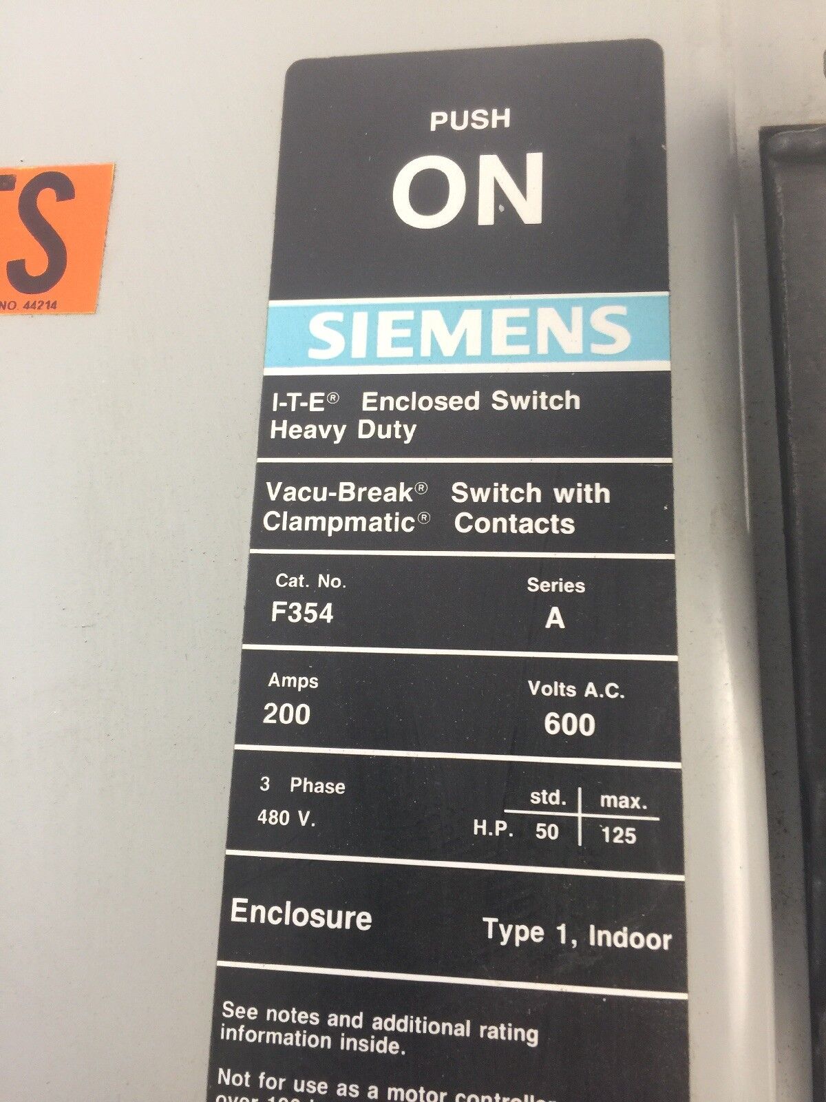 SIEMENS F354 VACU-BREAK SWITCH WITH CLAMPMATIC CONTACTS 200 AMP 600 VAC