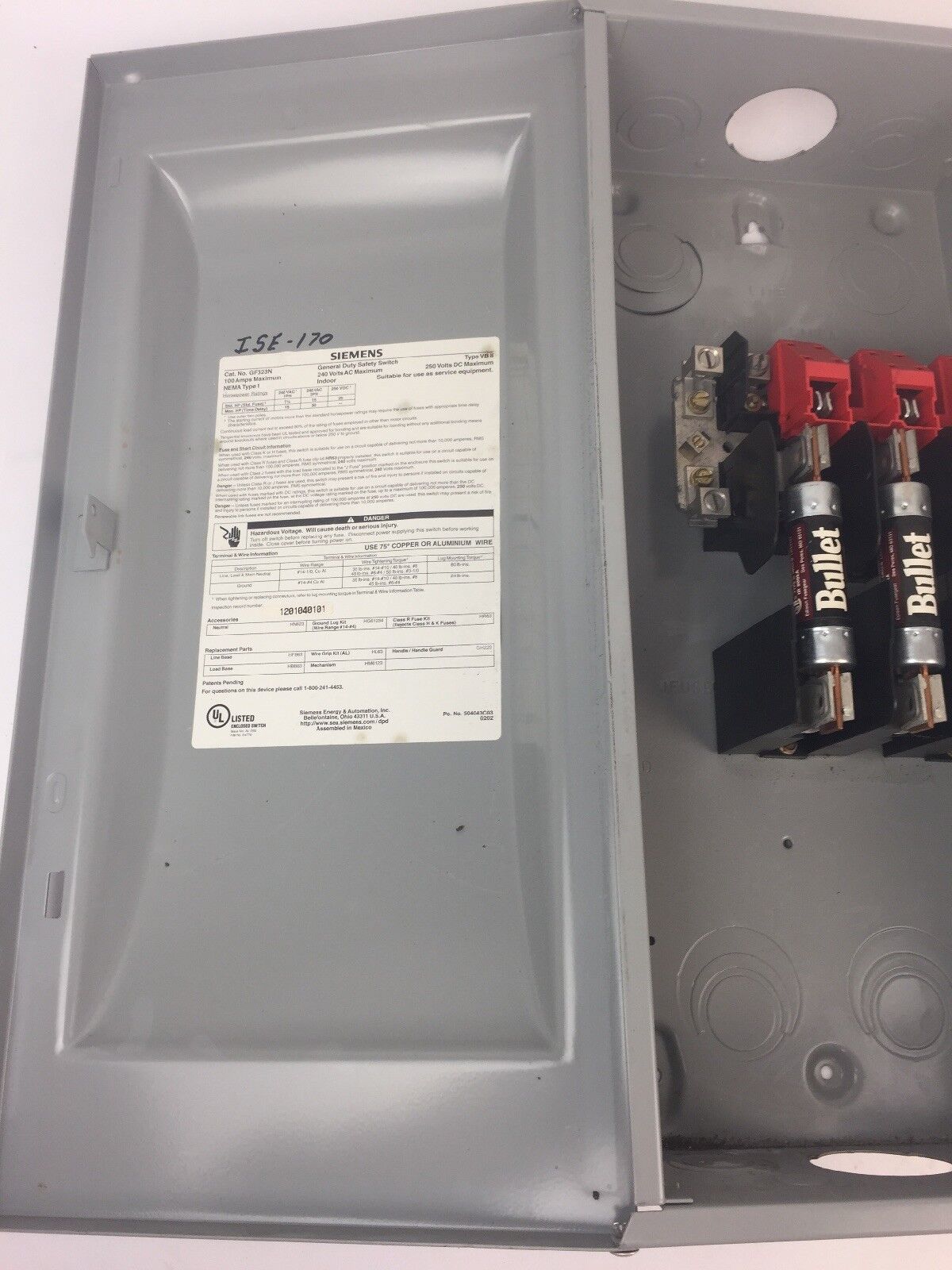 SIEMENS GF323N GENERAL DUTY SAFETY SWITCH 100A 240VAC 250VDC W/ 3 BULLET ECNR100