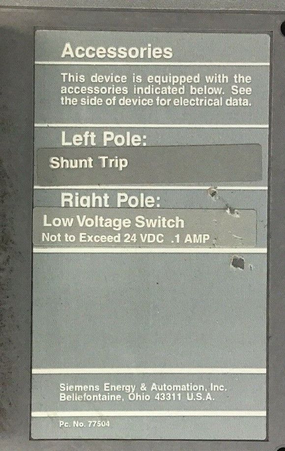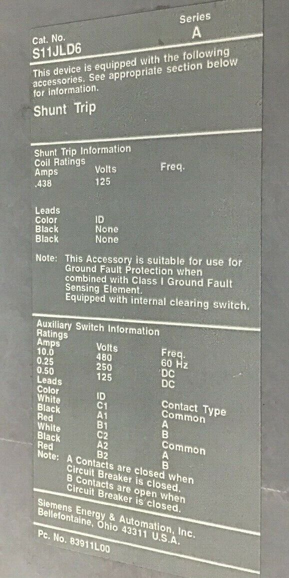 SIEMENS HJXD63S400A 400A MOLDED CASE SWITCH W/SHUNT S11JLD6 & A01JLDLY SENTRON SERIES