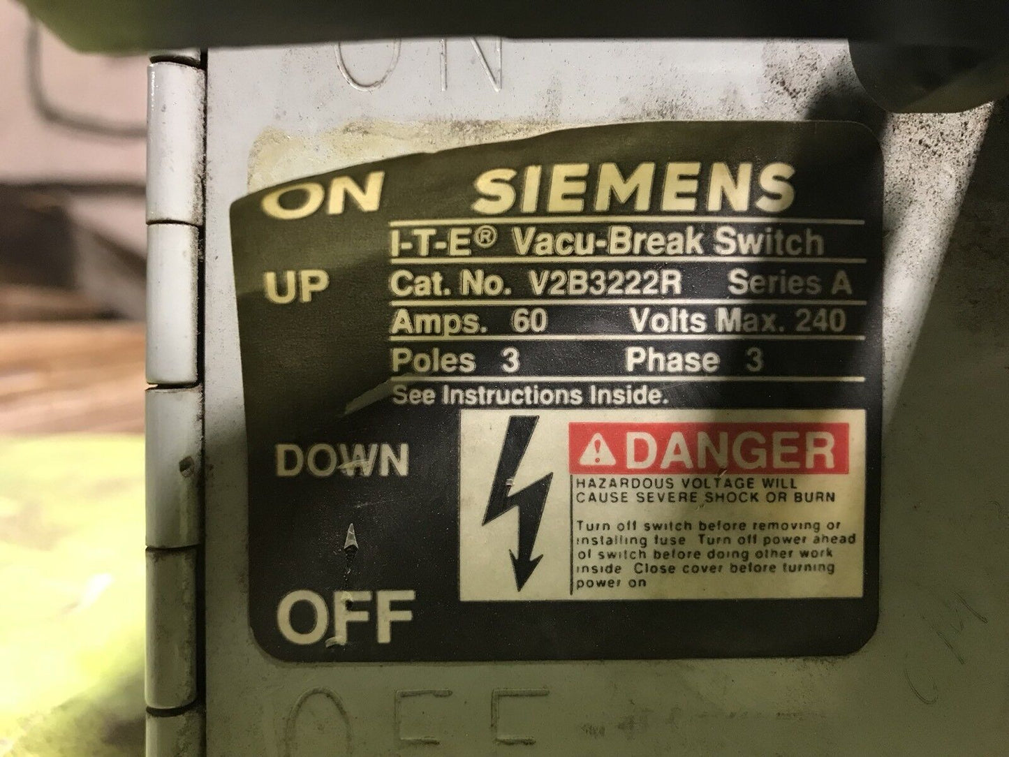 SIEMENS / I-T-E V2B3222R VACU-BREAK TWIN PANELBOARD SWITCH - 240V, 60A, 3P