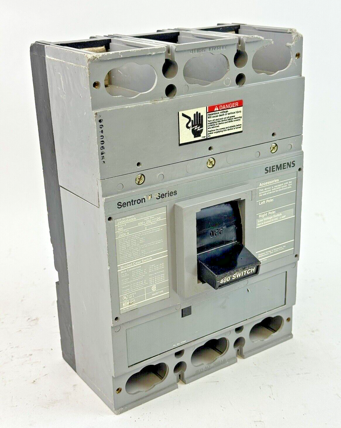 SIEMENS - JXD62S400A - MOLDED CASE SWITCH WITH A01JLDLV LOW VOLT AUXILIARY SWITCH - 2 POLE / 400 A / 600 VAC