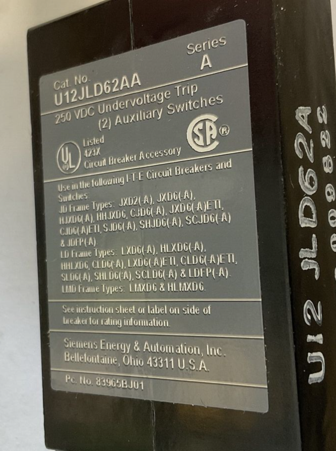 SIEMENS U12JLD62AA 250VDC UNDERVOLTAGE TRIP SER.A AUX.SWITCH