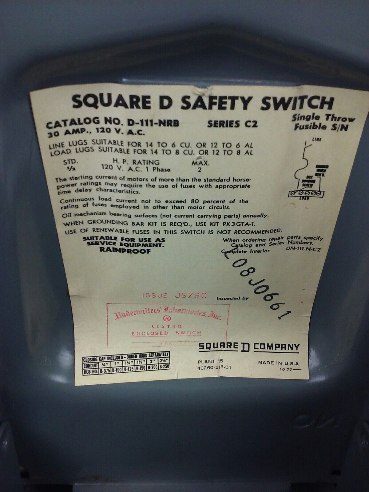 SQ.D D-111-NRB, SER. C2, SAFETY SWITCH, 1P, 30A, 120V, STD H.P. 1/2, MAX H.P 2, RAIN PROOF, SINGLE THROW FUSIBLE S/N, NEW