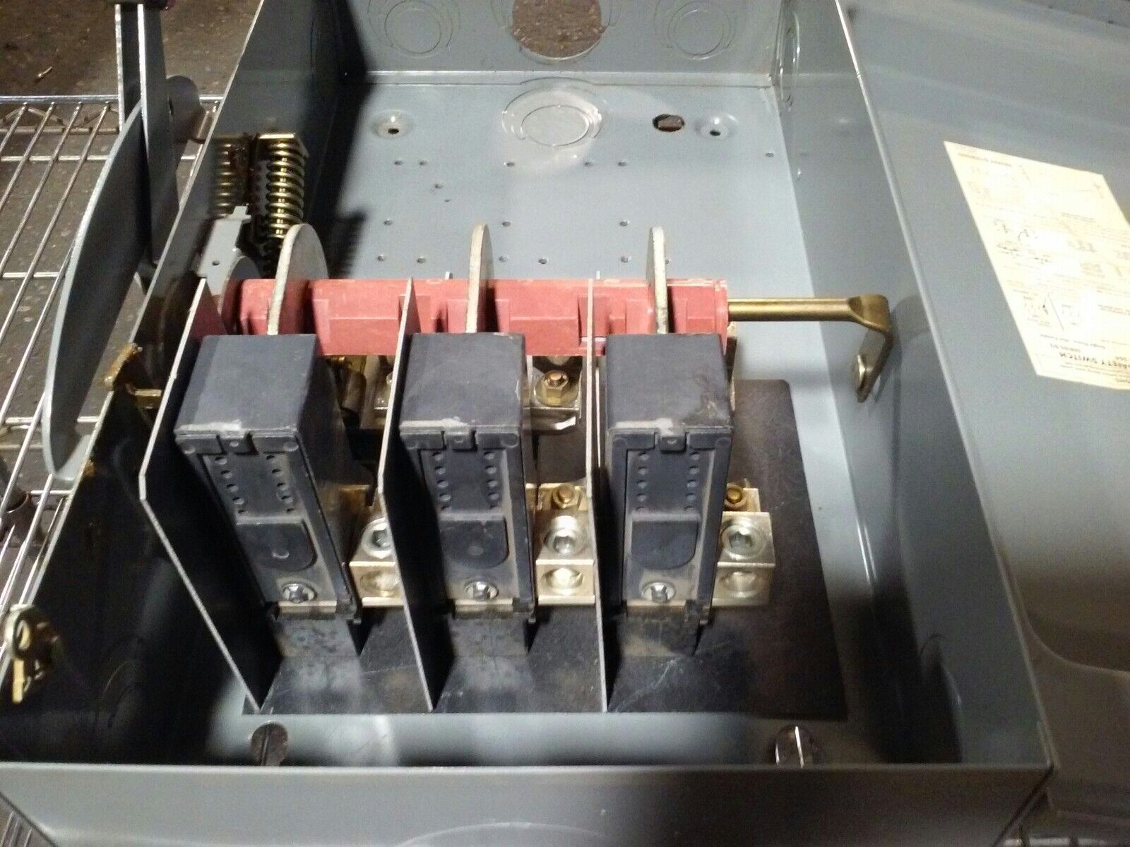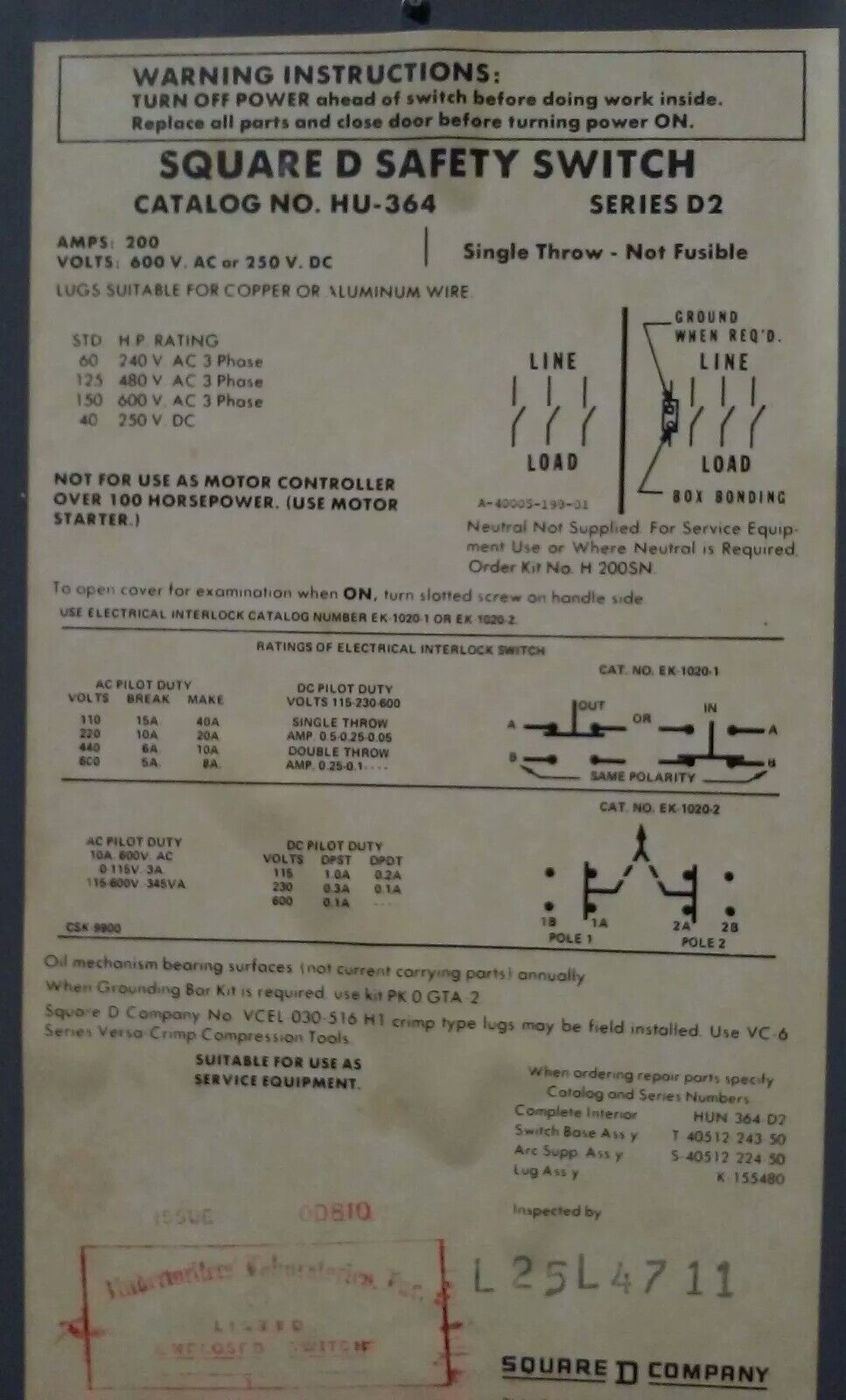 SQUARE D, HU364, SERIES D2, HEAVY DUTY SAFETY SWITCH, 200A, 600VAC/250DC, 3PH, 150 MAX HORSEPOWER, SINGLE THROW NON-FUSIBLE, HOLES NOTCHED OUT(REFERENCE PHOTOS) USED