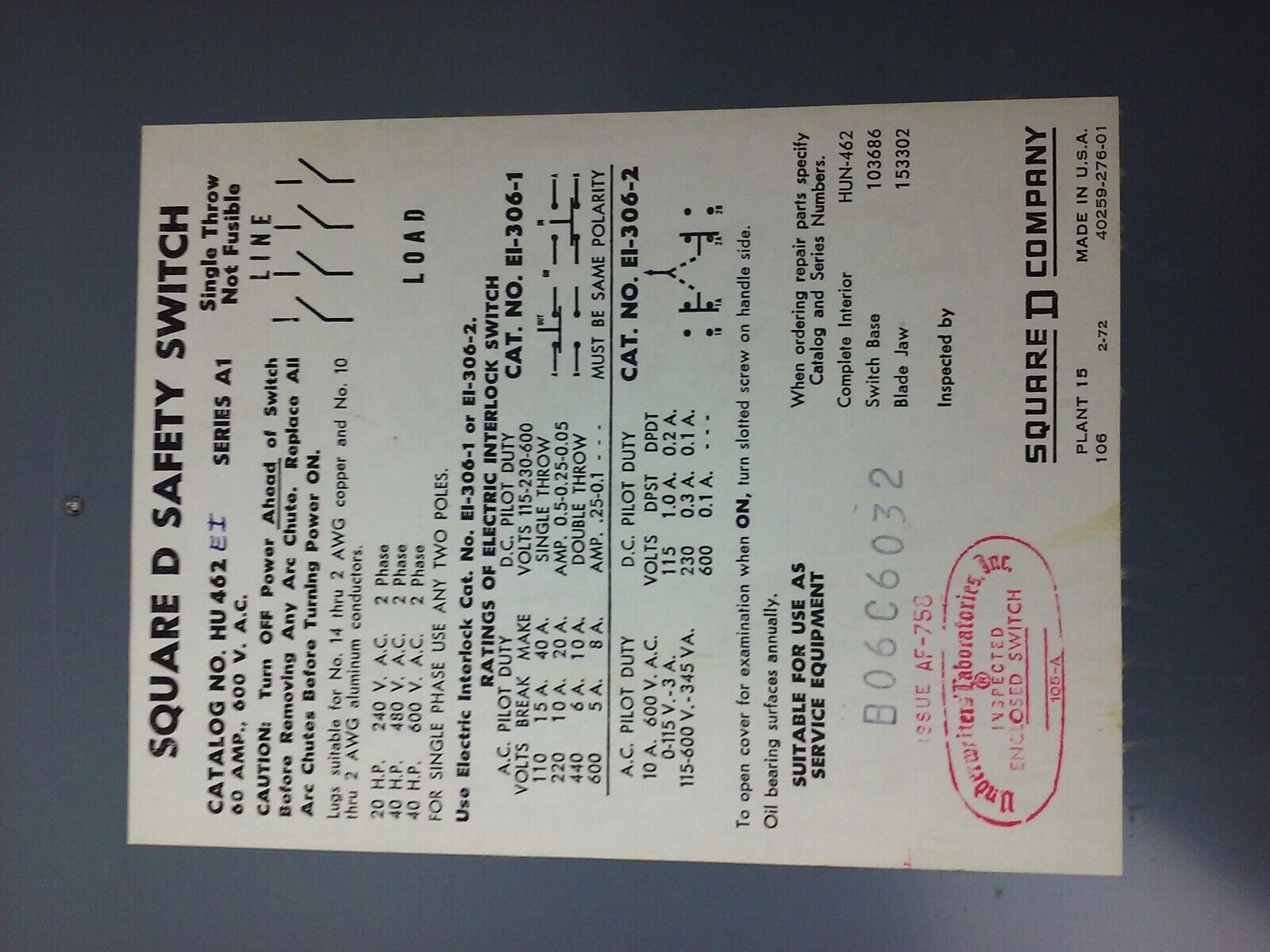 SQ. D HU462EI, SER. A1, H.D. SAFETY SWITCH, 60A, 240/480/600V, 2PH, NON FUSIBILE
