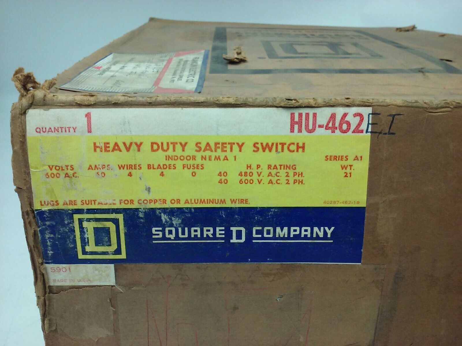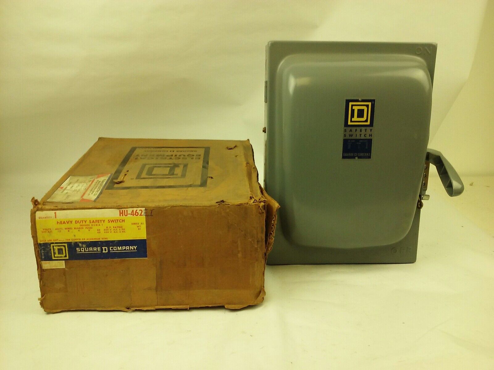 SQ. D HU462EI, SER. A1, H.D. SAFETY SWITCH, 60A, 240/480/600V, 2PH, 4 WIRES, 4 BLADES,INDOOR NEMA 1, SINGLE THROW NON FUSIBILE, NEW