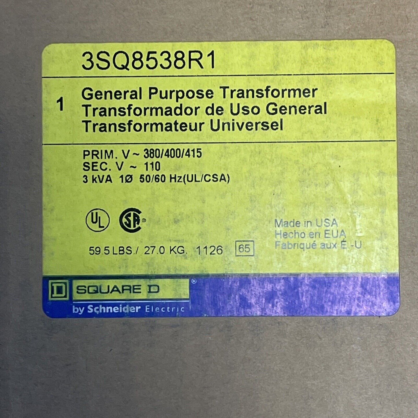 SQUARE D 3SQ8538R1 TRANSFORMER PRIM. 380/400/415VAC SEC. 110VAC 3kVA GENERAL