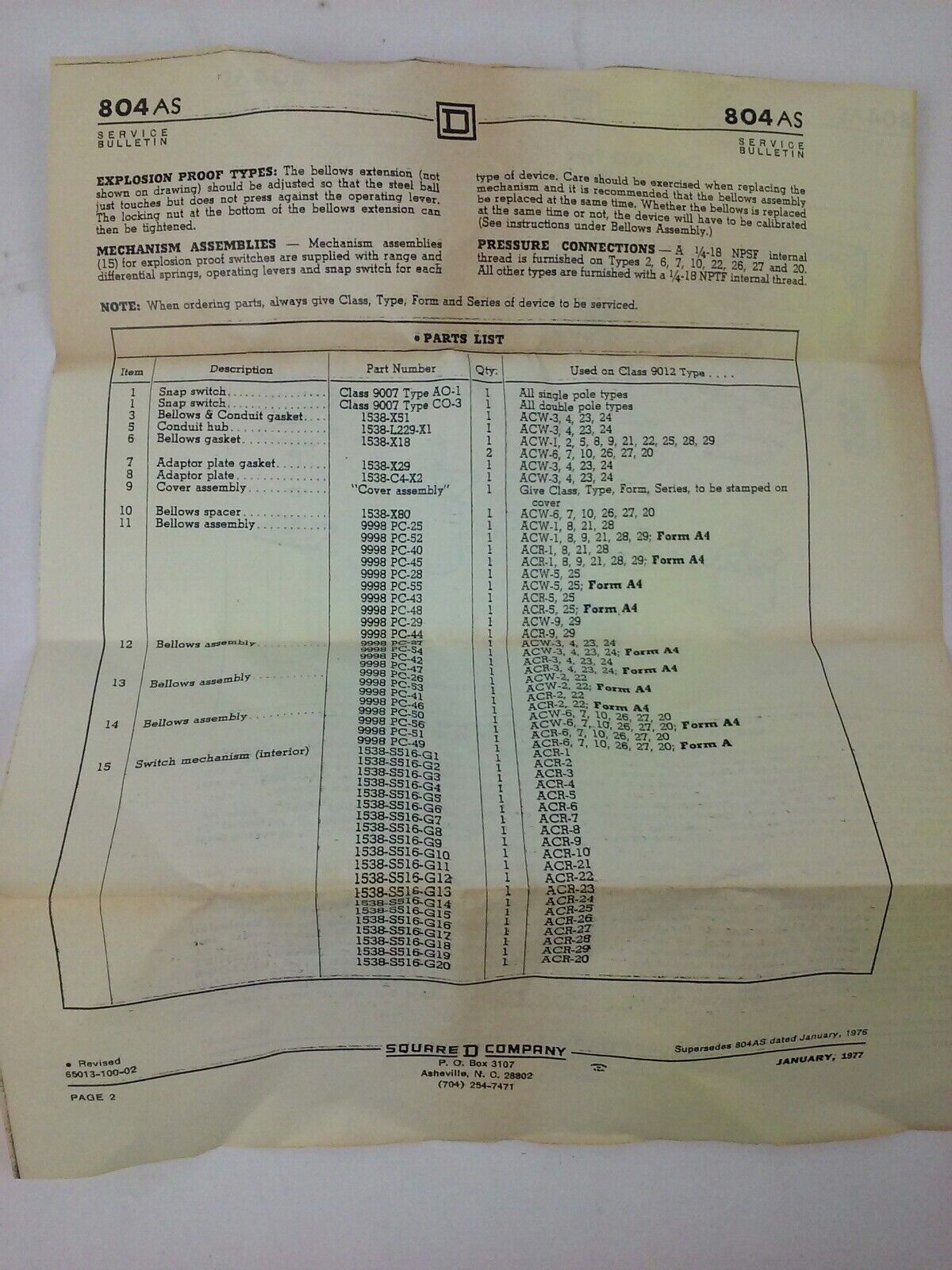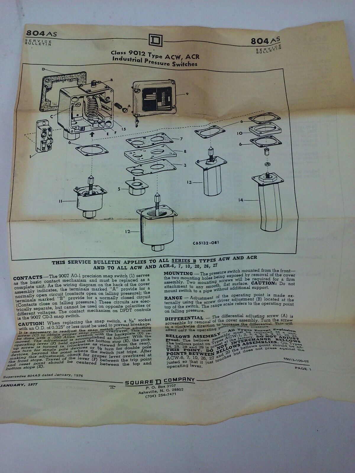 SQUARE D CLASS 9012 TYPE ACW1S11 SERIES B, INDUSTRIAL PRESSURE SWITCH,