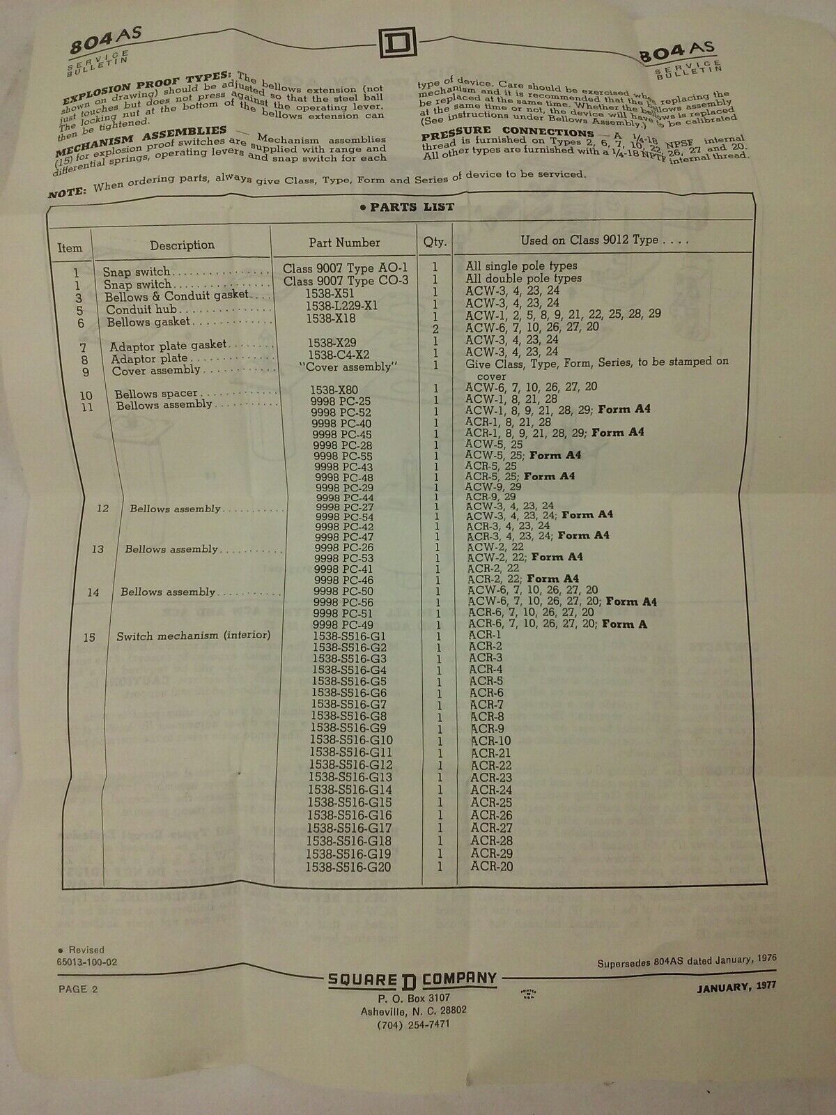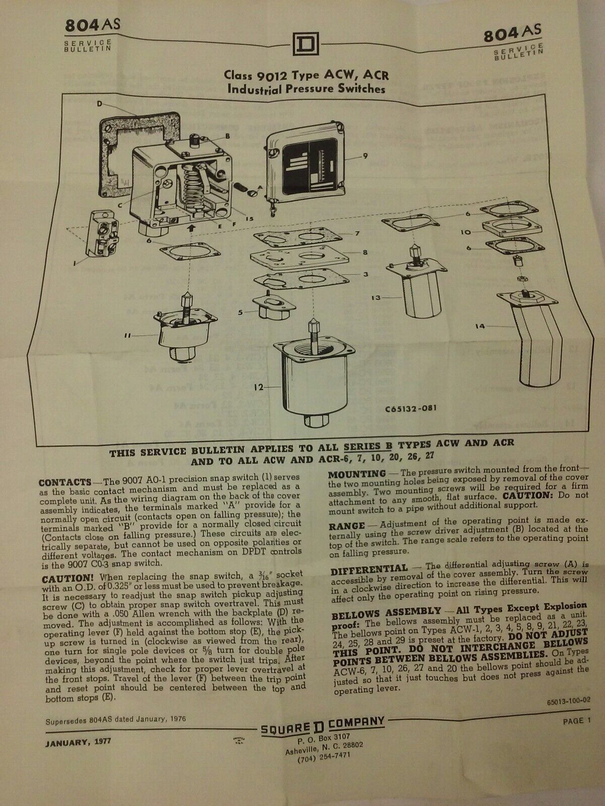 SQUARE D CLASS 9012 TYPE ACW5-S35 SERIES B, INDUSTRIAL PRESSURE SWITCH,