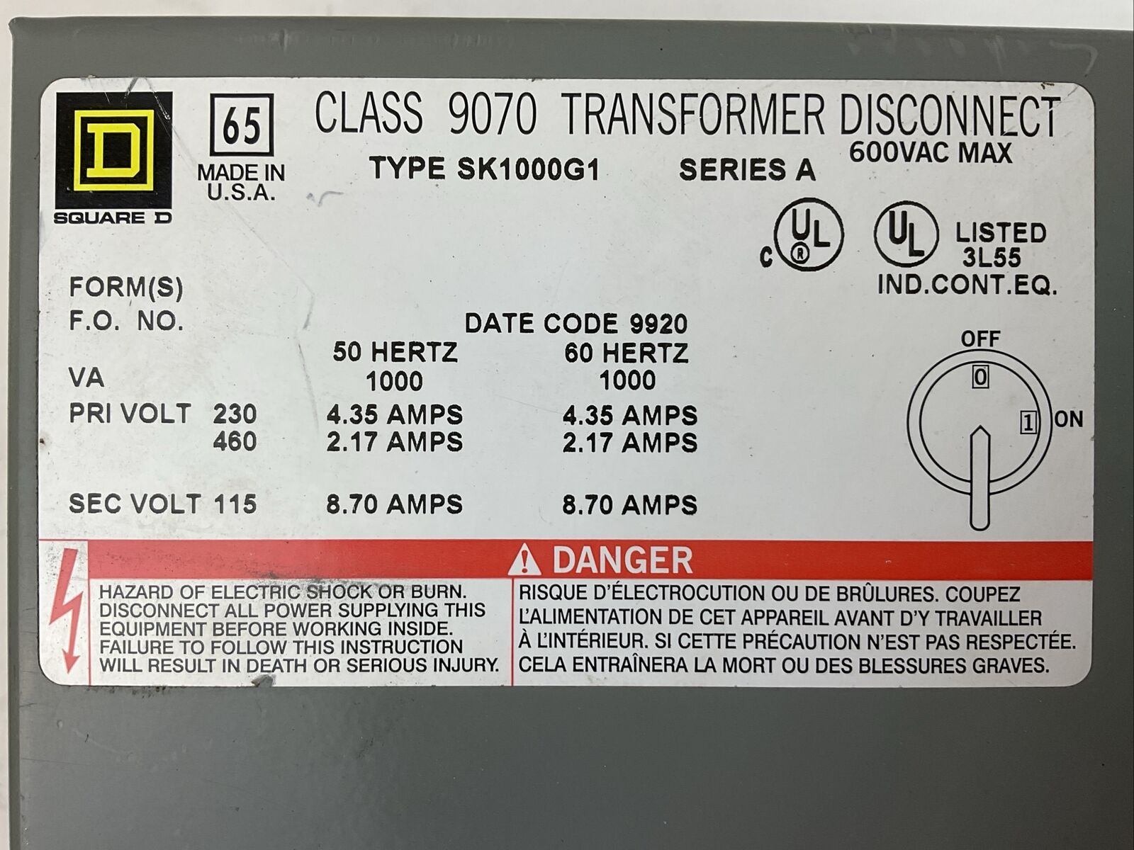SQUARE D 9070 SK1000G1 TRANSFORMER DISCONNECT SER A PRI VOLT 230 4.35A 460 2.17A