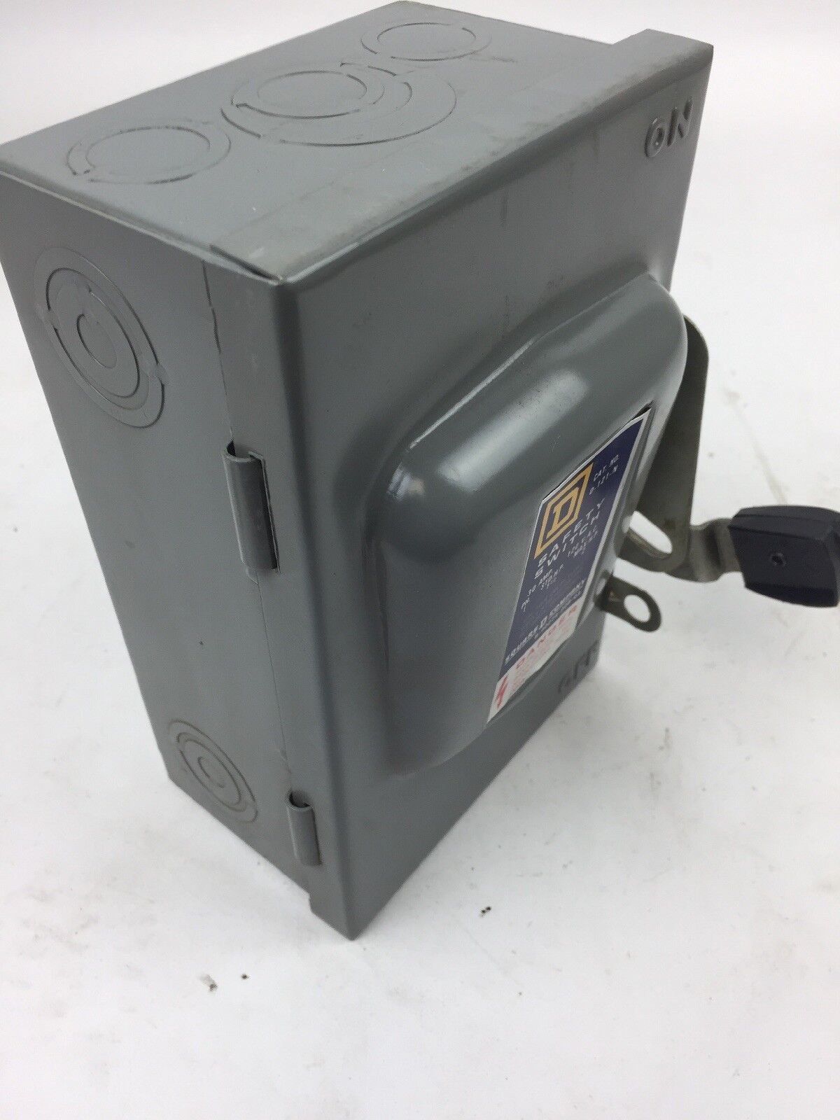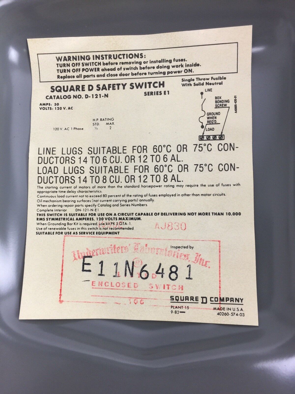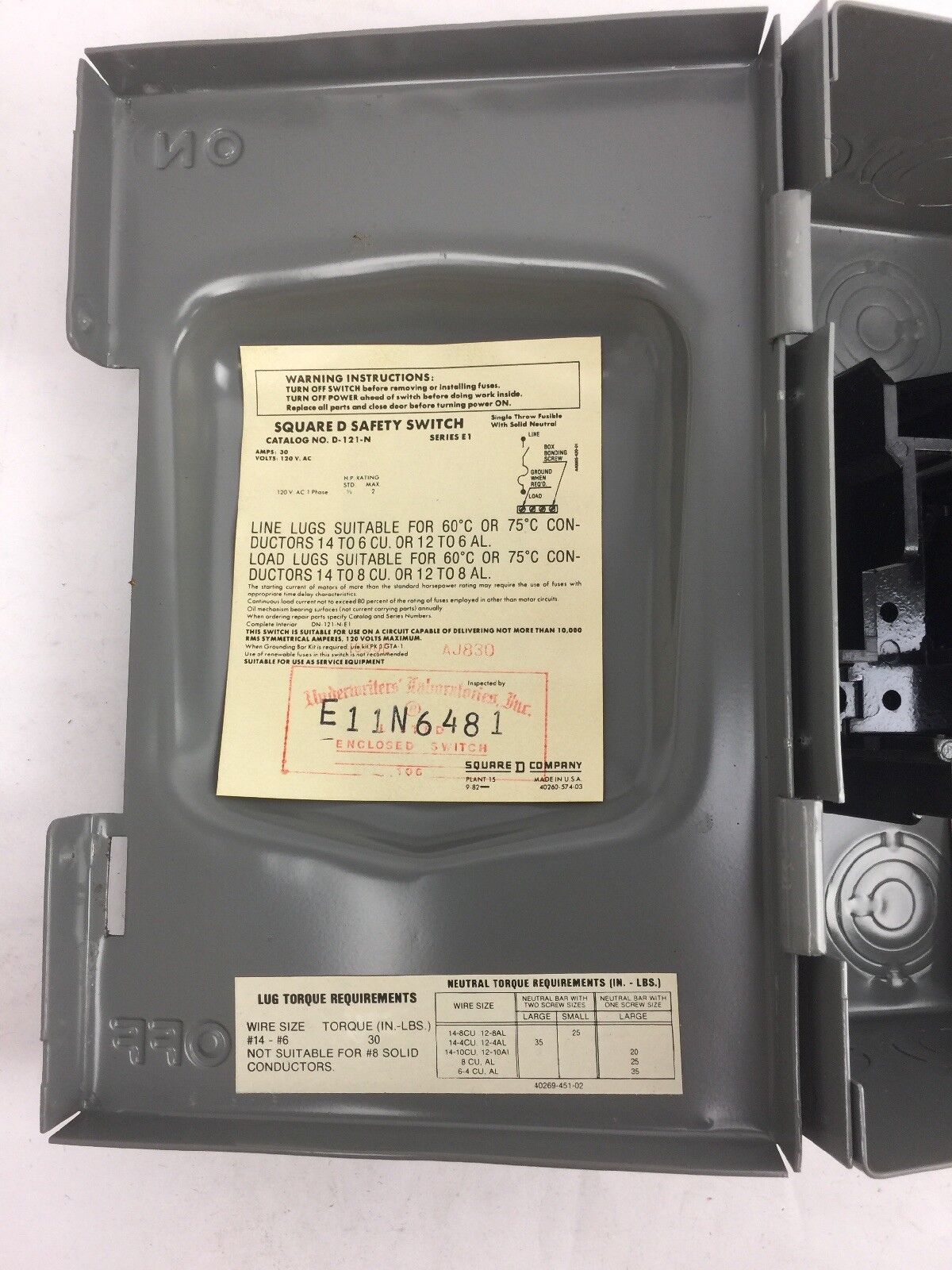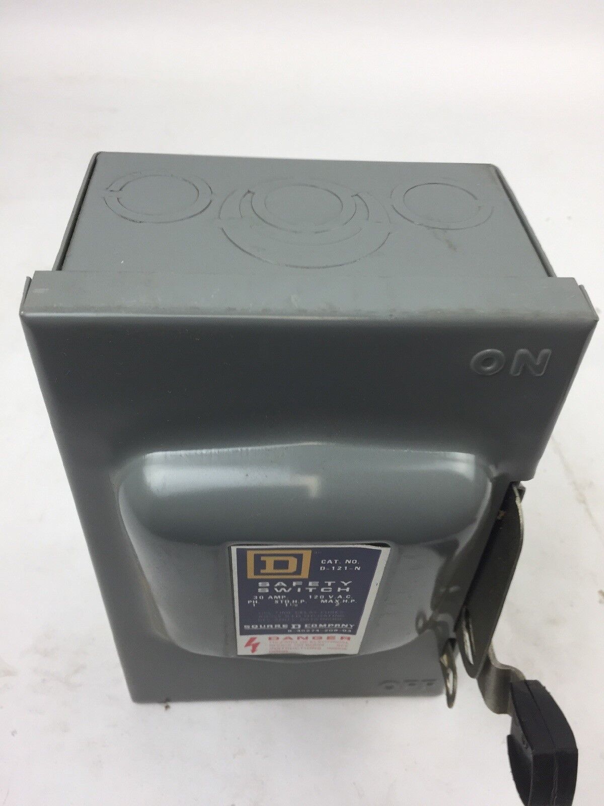 SQUARE D D-121-N SAFETY SWITCH 30 AMP 120 V.A.C. PH 1 STD H.P. 1 1/2 MAX H.P. 2